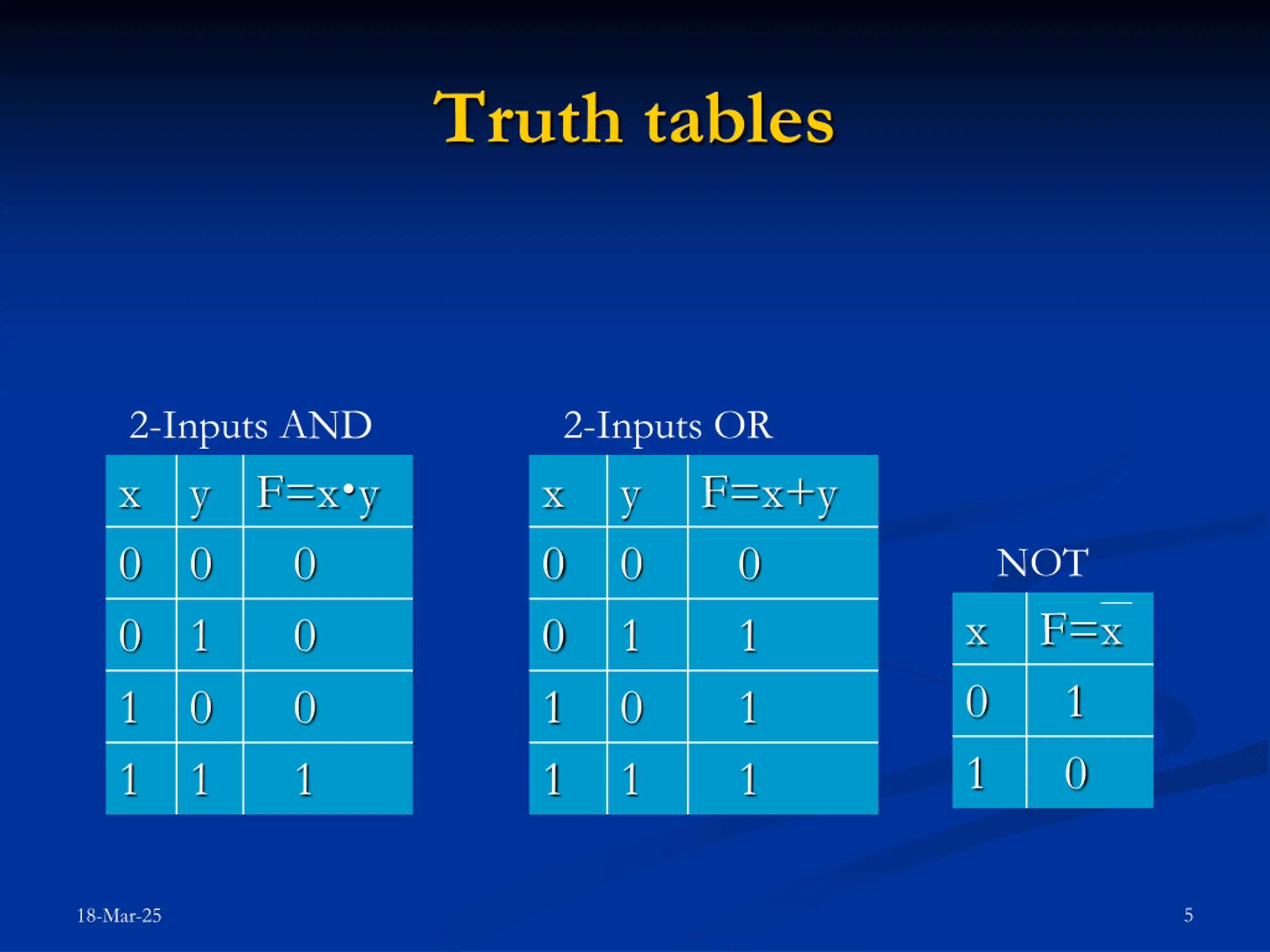 Truth tables 2-Inputs AND 2-Inputs OR F=x y 0 0 0 1 x 0 0 1 1 y 0 1 0 1 x 0 0 1 1 y 0 1 0 1 F=x+y 0 1 1 1 NOT x 0 1 F=x 1 0 5 18-Mar-25