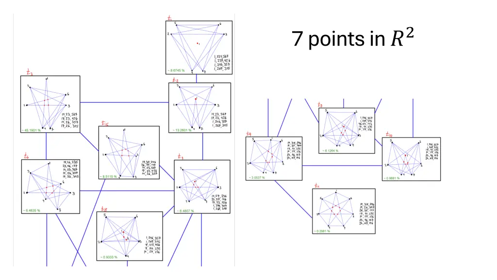 Bukh, Loh, & Nivaschs theorem (? = 4,? = 3) Theorem (Bukh, Loh, and Nivasch, 2017): Let ? be a tree-like ?- uniform simple hypergraph with ?+1 edges and ?=(?+1)(? 1)+1 vertices. It is possible to associate to the vertices of each such hypergraph ? a set ? of ? points in ?^? so that the Tverberg partitions of ? correspond precisely to rainbow coloring of the hypergraph ?. Moreover, the number of rainbow coloring is (? 1)!^?. (Here, we consider two colorings as the same if they differ by a permutation of the colors.)