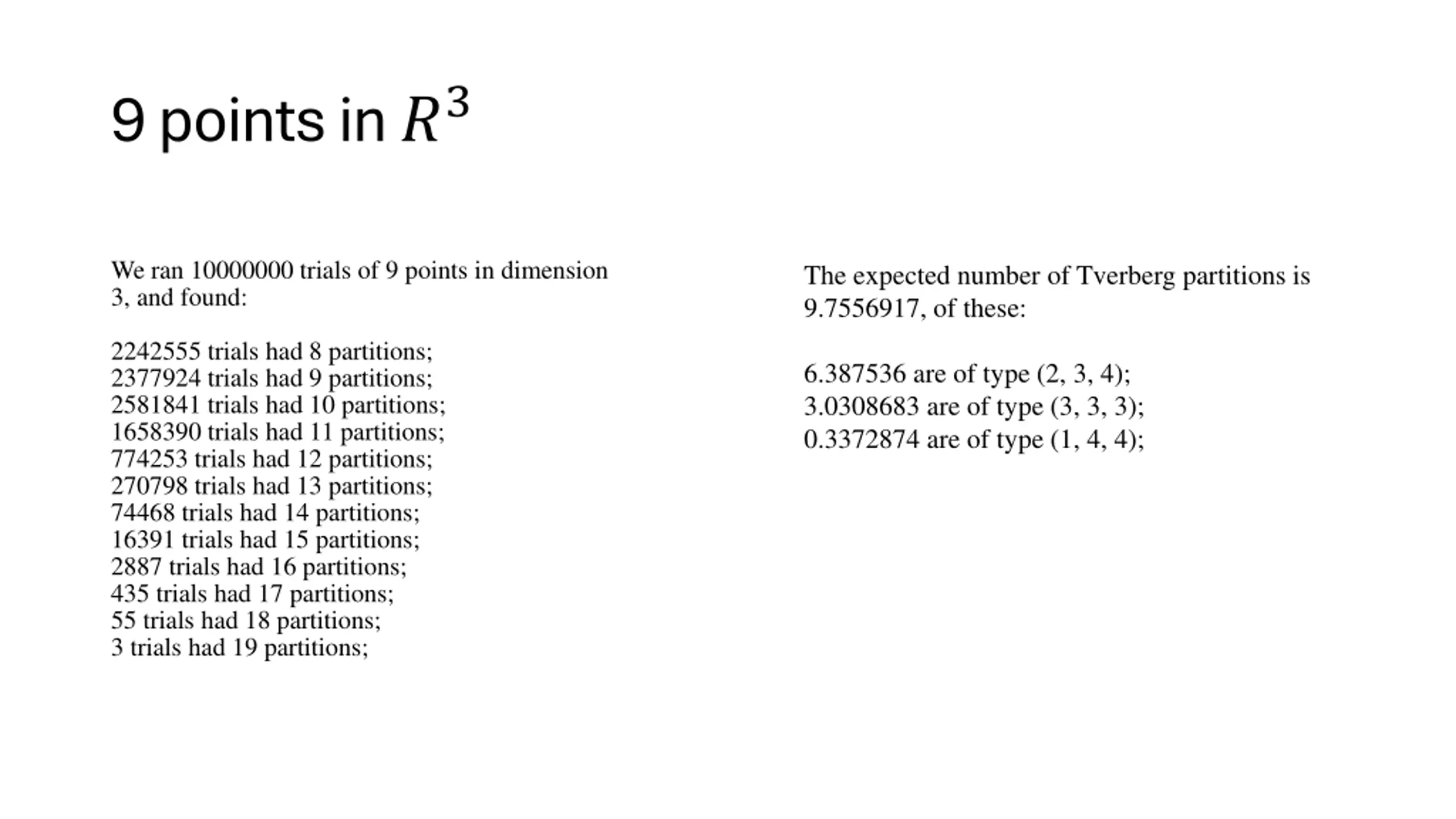 9 points in ?3 We ran 10000000 trials of 9 points in dimension 3, and found: The expected number of Tverberg partitions is 9.7556917, of these: 2242555 trials had 8 partitions; 2377924 trials had 9 partitions; 2581841 trials had 10 partitions; 1658390 trials had 11 partitions; 774253 trials had 12 partitions; 270798 trials had 13 partitions; 74468 trials had 14 partitions; 16391 trials had 15 partitions; 2887 trials had 16 partitions; 435 trials had 17 partitions; 55 trials had 18 partitions; 3 trials had 19 partitions; 6.387536 are of type (2, 3, 4); 3.0308683 are of type (3, 3, 3); 0.3372874 are of type (1, 4, 4);