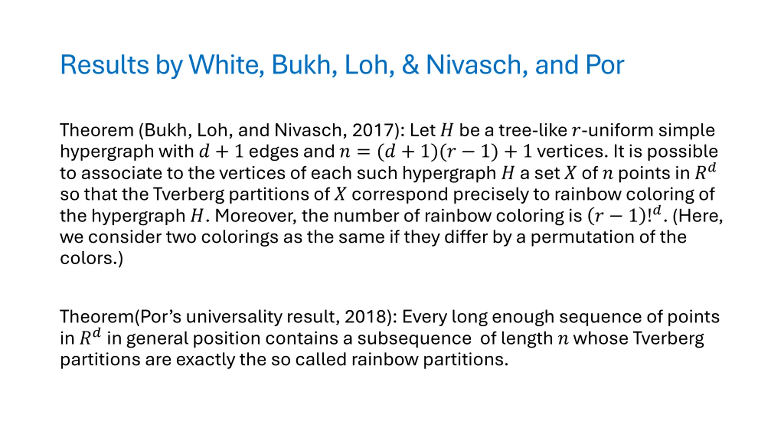 Results by White, Bukh, Loh, & Nivasch, and Por Theorem (Bukh, Loh, and Nivasch, 2017): Let ? be a tree-like ?-uniform simple hypergraph with ? + 1 edges and ? = (? + 1)(? 1) + 1 vertices. It is possible to associate to the vertices of each such hypergraph ? a set ? of ? points in ?? so that the Tverberg partitions of ? correspond precisely to rainbow coloring of the hypergraph ?. Moreover, the number of rainbow coloring is ? 1 !?. (Here, we consider two colorings as the same if they differ by a permutation of the colors.) Theorem(Por s universality result, 2018): Every long enough sequence of points in ?? in general position contains a subsequence of length ? whose Tverberg partitions are exactly the so called rainbow partitions.