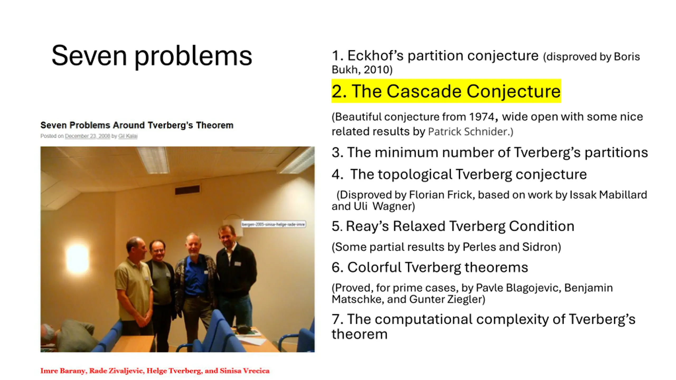 Seven problems 1. Eckhof s partition conjecture(disproved by Boris Bukh, 2010) 2. The Cascade Conjecture (Beautiful conjecture from 1974, wide open with some nice related results by Patrick Schnider.) 3. The minimum number of Tverberg s partitions 4. The topological Tverberg conjecture (Disproved by Florian Frick, based on work by Issak Mabillard and Uli Wagner) 5. Reay s Relaxed Tverberg Condition (Some partial results by Perles and Sidron) 6. Colorful Tverberg theorems (Proved, for prime cases, by Pavle Blagojevic, Benjamin Matschke, and Gunter Ziegler) 7. The computational complexity of Tverberg s theorem