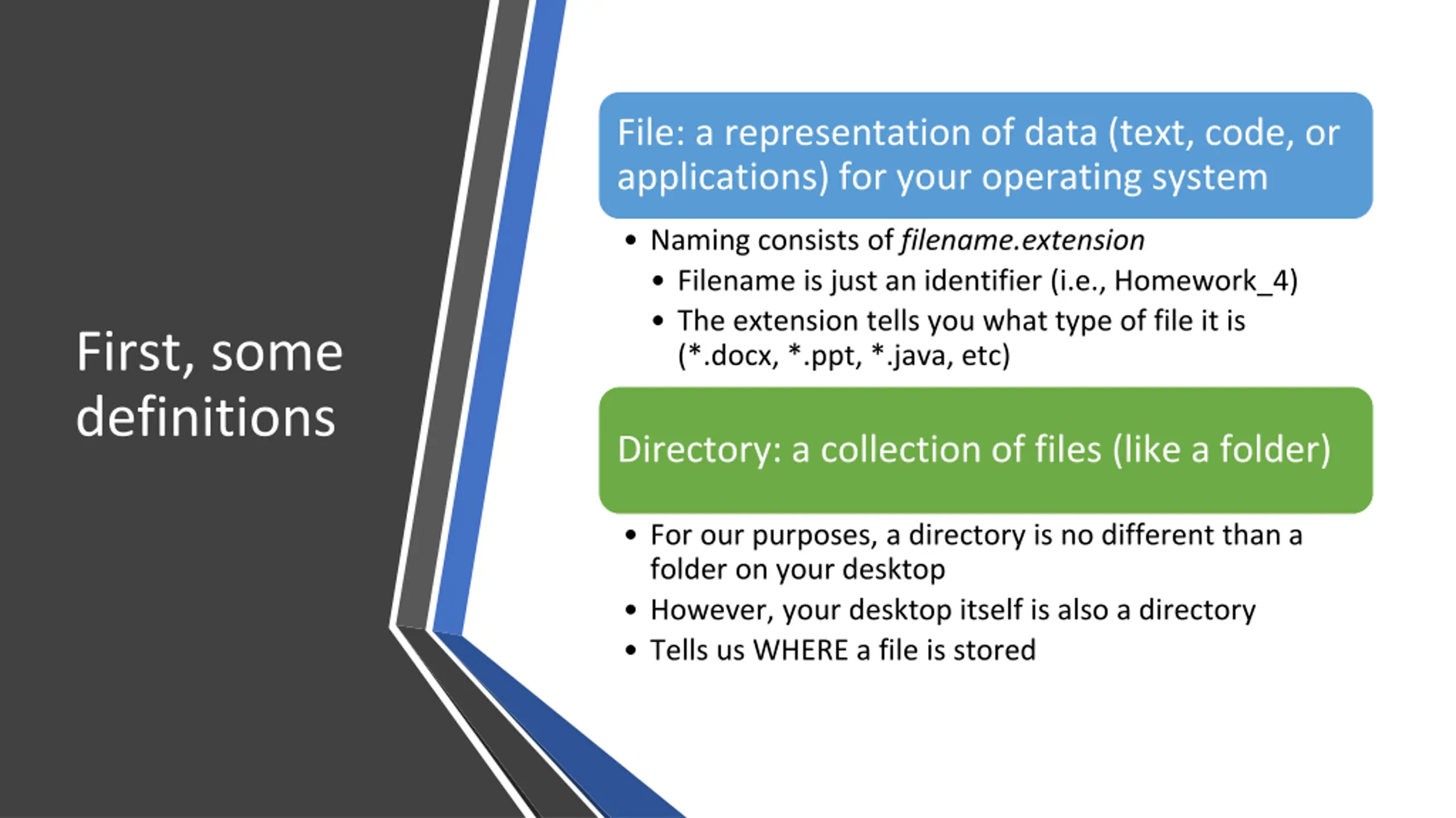 File: a representation of data (text, code, or applications) for your operating system Naming consists of filename.extension Filename is just an identifier (i.e., Homework_4) The extension tells you what type of file it is (*.docx, *.ppt, *.java, etc) First, some definitions Directory: a collection of files (like a folder) For our purposes, a directory is no different than a folder on your desktop However, your desktop itself is also a directory Tells us WHERE a file is stored