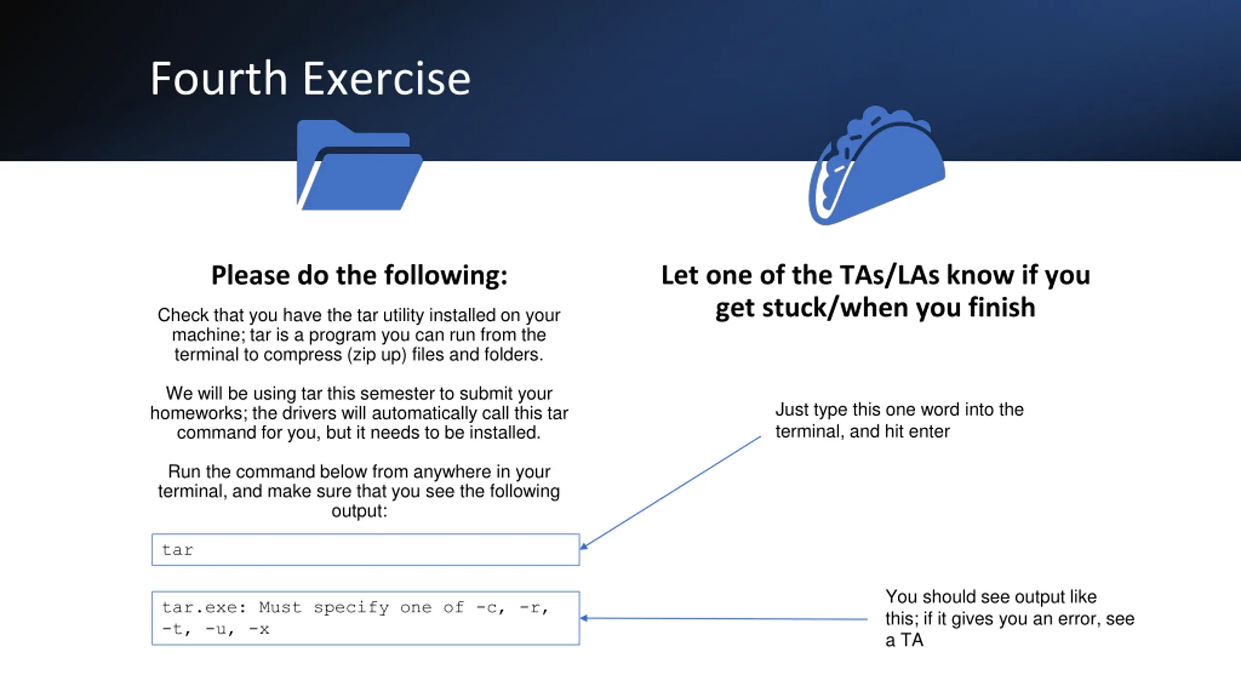 Fourth Exercise Let one of the TAs/LAs know if you get stuck/when you finish Please do the following: Check that you have the tar utility installed on your machine; tar is a program you can run from the terminal to compress (zip up) files and folders. We will be using tar this semester to submit your homeworks; the drivers will automatically call this tar command for you, but it needs to be installed. Just type this one word into the terminal, and hit enter Run the command below from anywhere in your terminal, and make sure that you see the following output: tar You should see output like this; if it gives you an error, see a TA tar.exe: Must specify one of -c, -r, -t, -u, -x