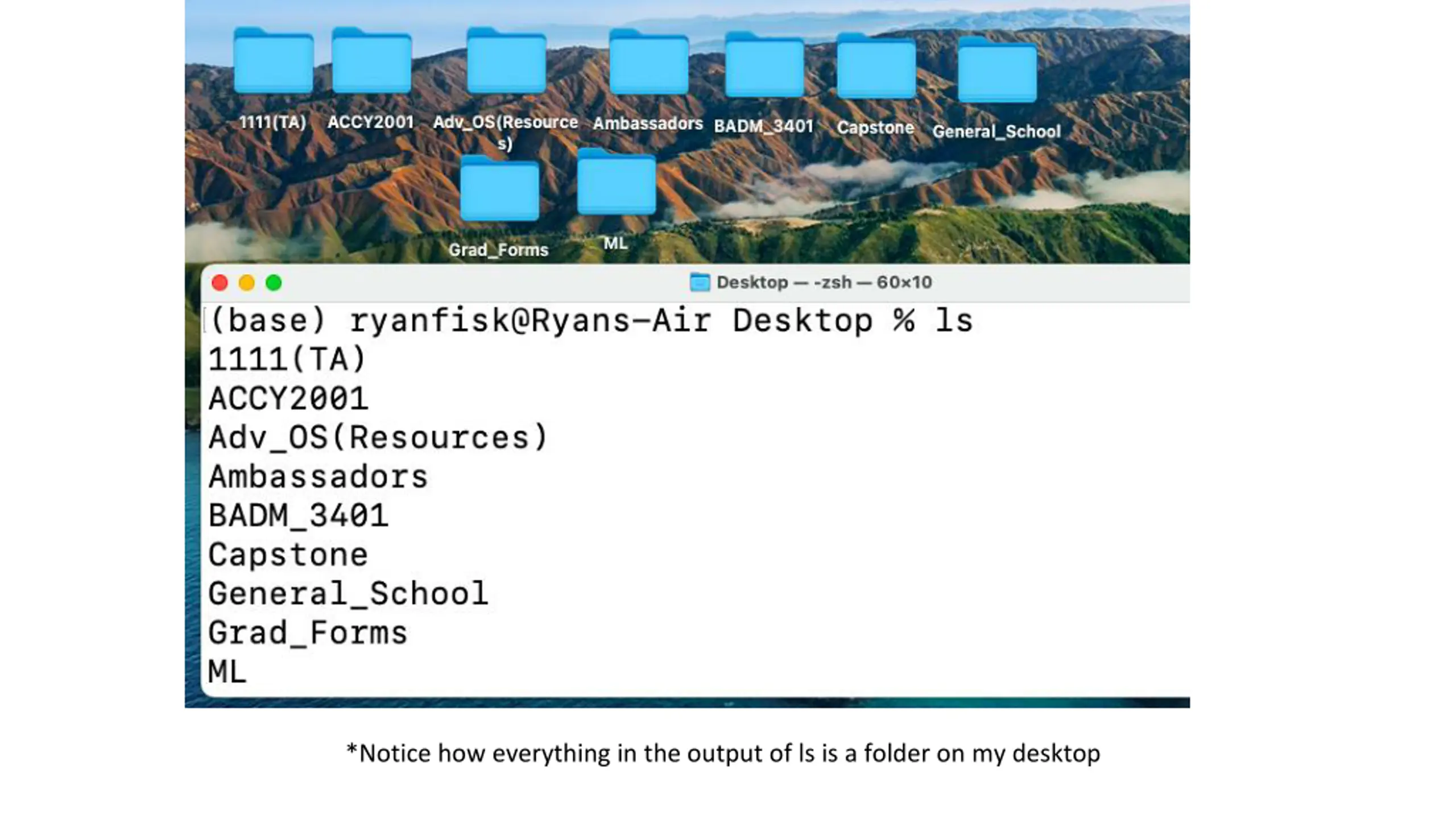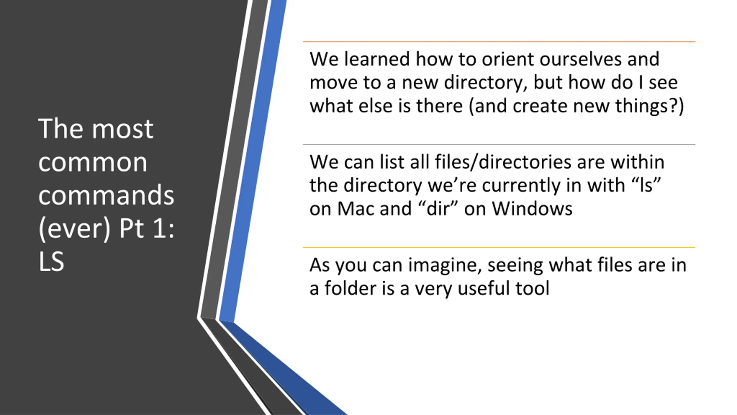 We learned how to orient ourselves and move to a new directory, but how do I see what else is there (and create new things?) The most common commands (ever) Pt 1: LS We can list all files/directories are within the directory we re currently in with ls on Mac and dir on Windows As you can imagine, seeing what files are in a folder is a very useful tool