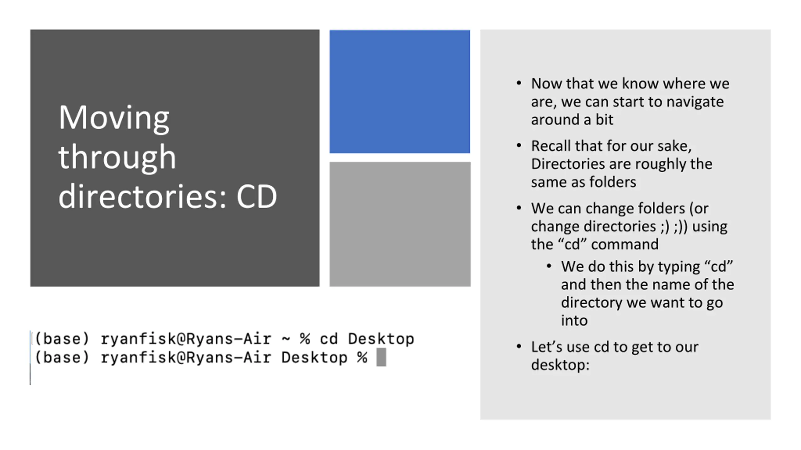 Now that we know where we are, we can start to navigate around a bit Recall that for our sake, Directories are roughly the same as folders We can change folders (or change directories ;) ;)) using the cd command We do this by typing cd and then the name of the directory we want to go into Let s use cd to get to our desktop: Moving through directories: CD
