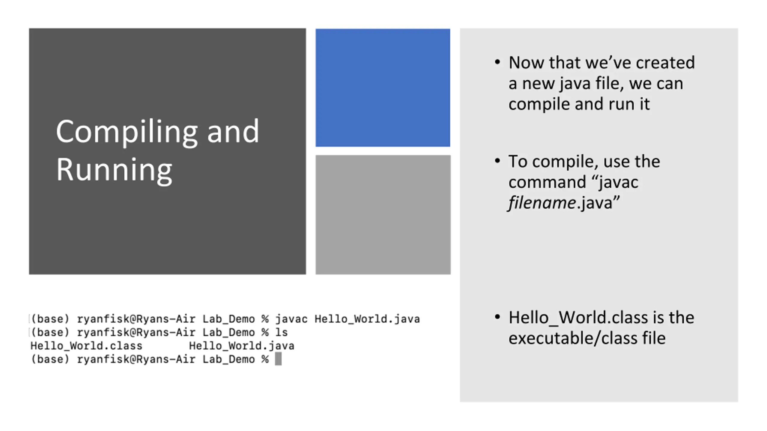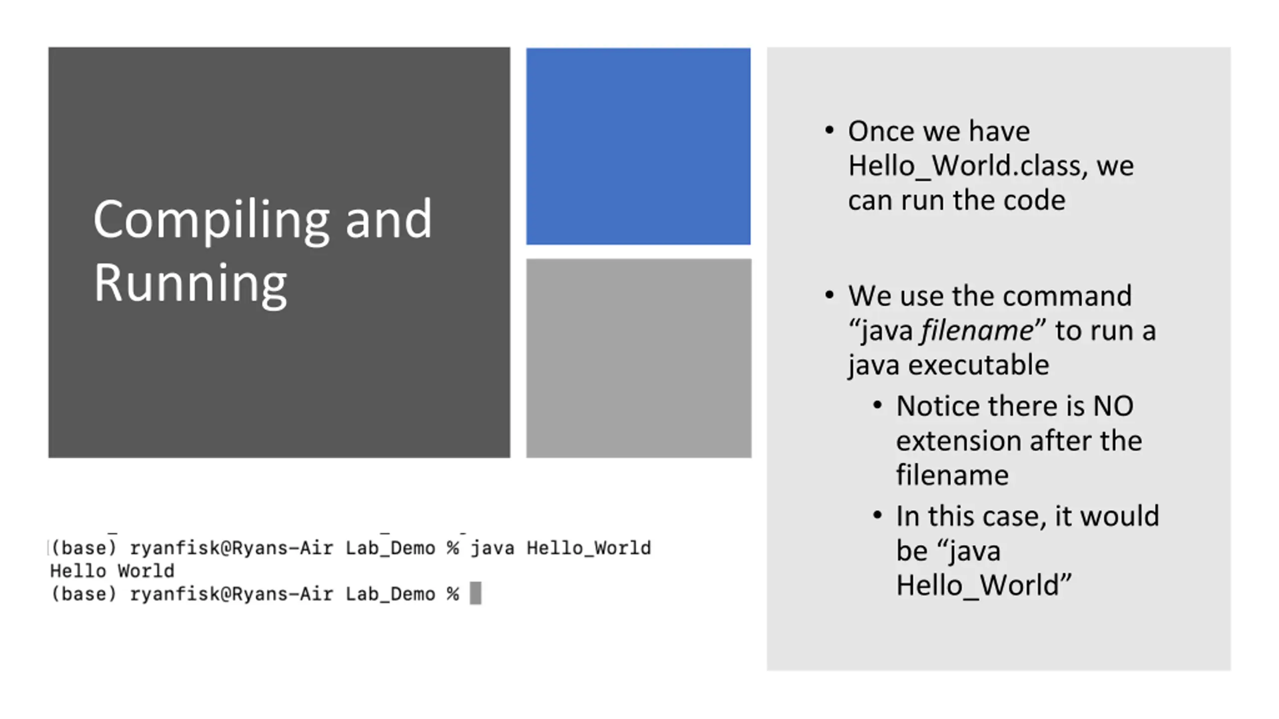 Once we have Hello_World.class, we can run the code Compiling and Running We use the command java filename to run a java executable Notice there is NO extension after the filename In this case, it would be java Hello_World