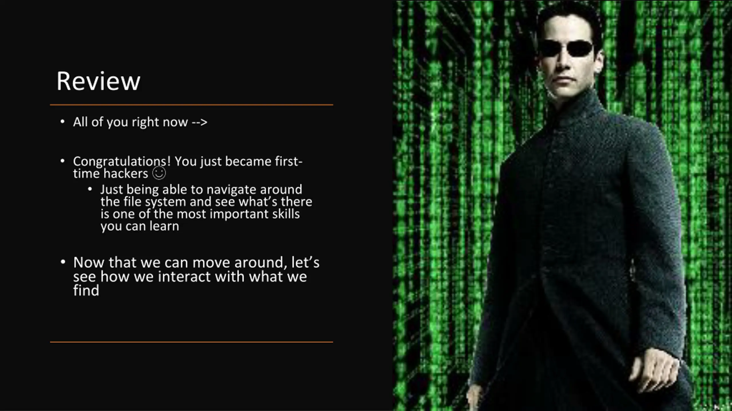 Review All of you right now --> Congratulations! You just became first- time hackers Just being able to navigate around the file system and see what s there is one of the most important skills you can learn Now that we can move around, let s see how we interact with what we find