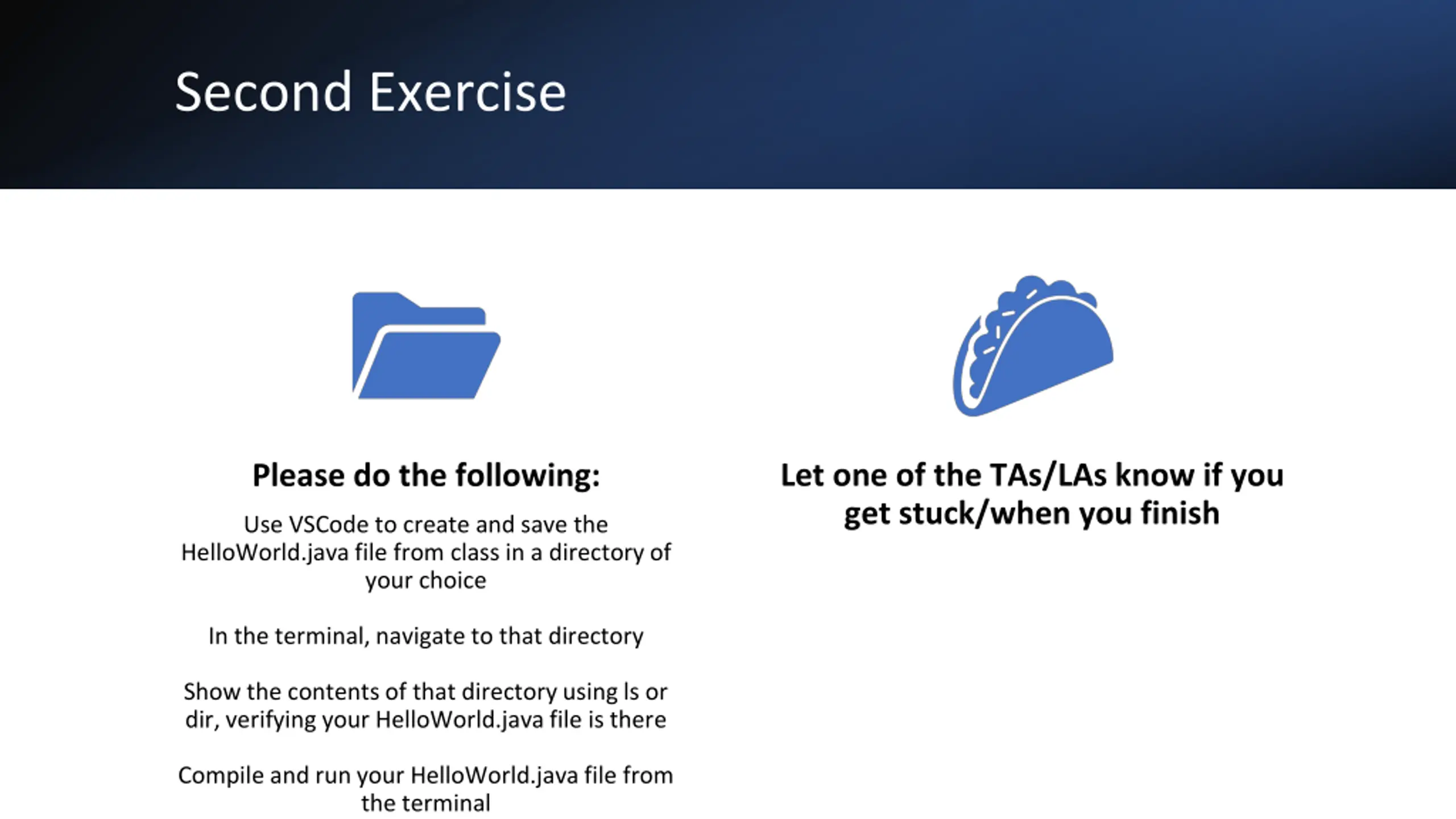 Second Exercise Let one of the TAs/LAs know if you get stuck/when you finish Please do the following: Use VSCode to create and save the HelloWorld.java file from class in a directory of your choice In the terminal, navigate to that directory Show the contents of that directory using ls or dir, verifying your HelloWorld.java file is there Compile and run your HelloWorld.java file from the terminal