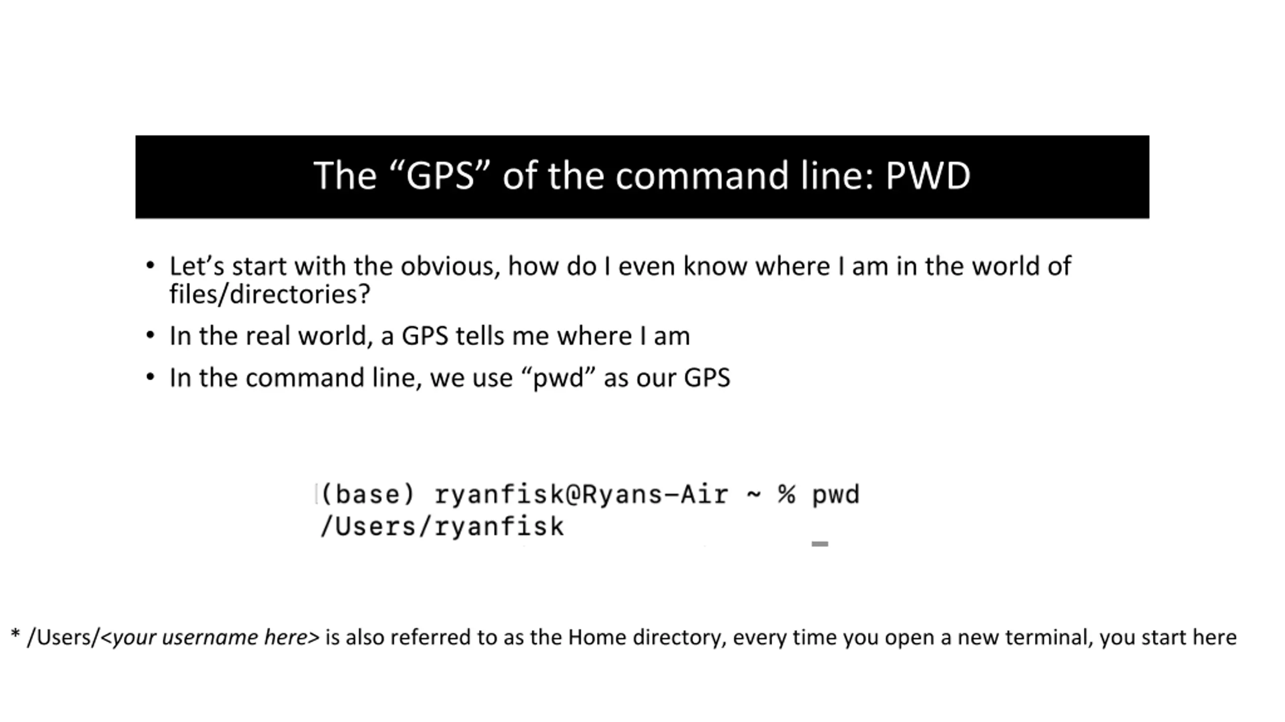 The GPS of the command line: PWD Let s start with the obvious, how do I even know where I am in the world of files/directories? In the real world, a GPS tells me where I am In the command line, we use pwd as our GPS * /Users/<your username here> is also referred to as the Home directory, every time you open a new terminal, you start here