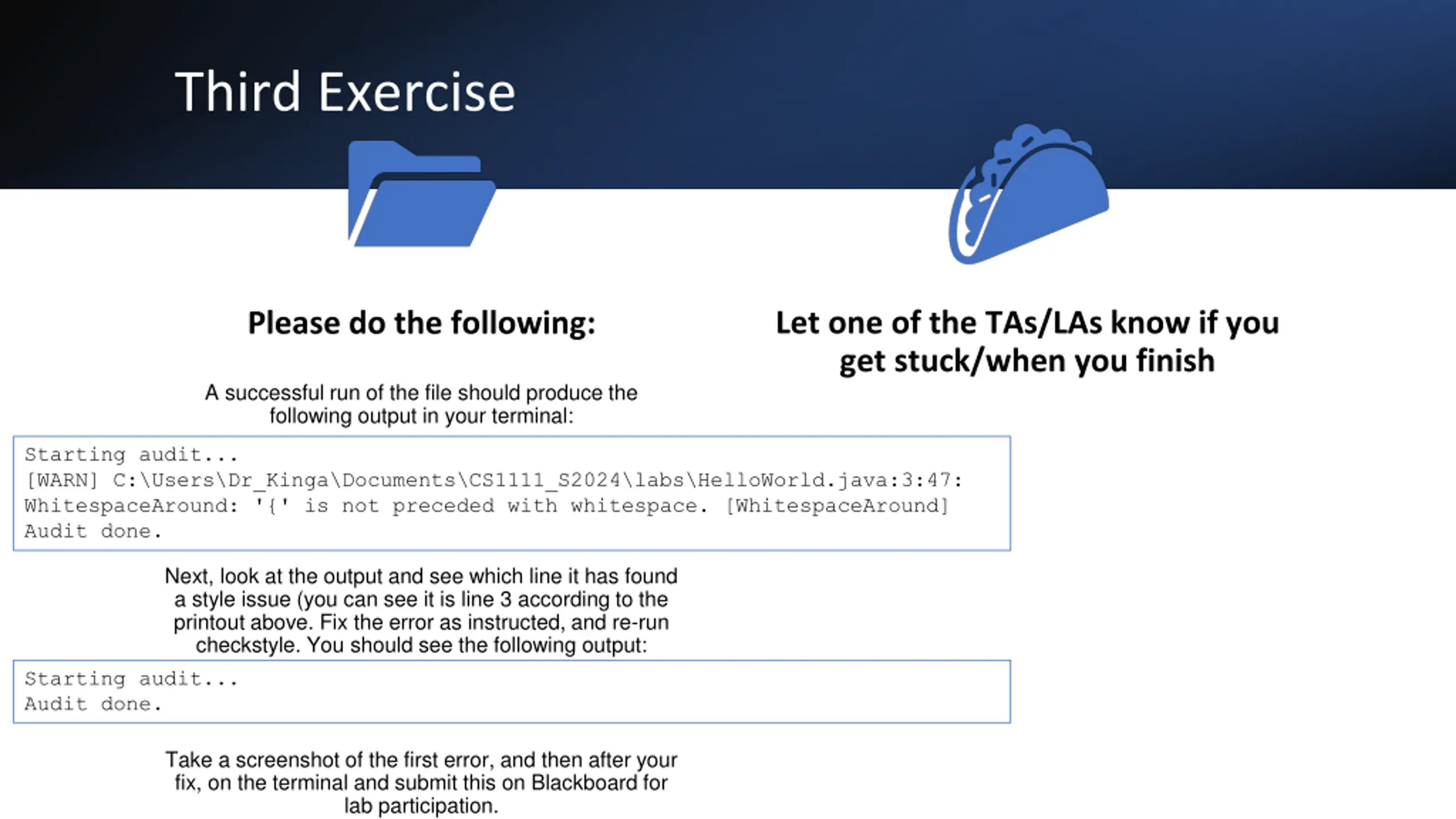 Third Exercise Let one of the TAs/LAs know if you get stuck/when you finish Please do the following: A successful run of the file should produce the following output in your terminal: Starting audit... [WARN] C:\Users\Dr_Kinga\Documents\CS1111_S2024\labs\HelloWorld.java:3:47: WhitespaceAround: '{' is not preceded with whitespace. [WhitespaceAround] Audit done. Next, look at the output and see which line it has found a style issue (you can see it is line 3 according to the printout above. Fix the error as instructed, and re-run checkstyle. You should see the following output: Starting audit... Audit done. Take a screenshot of the first error, and then after your fix, on the terminal and submit this on Blackboard for lab participation.