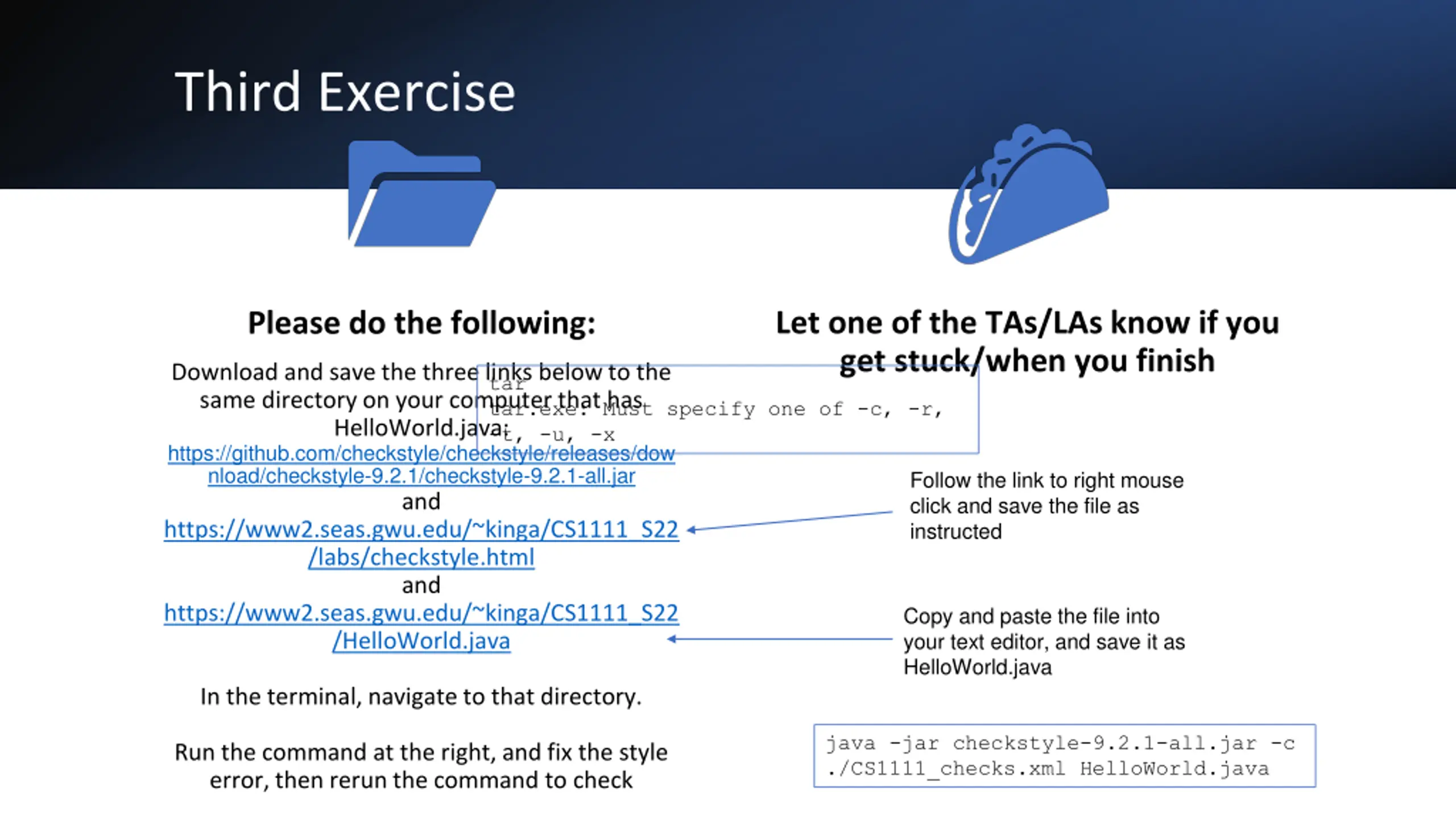 Third Exercise Let one of the TAs/LAs know if you get stuck/when you finish Please do the following: Download and save the three links below to the same directory on your computer that has HelloWorld.java: https://github.com/checkstyle/checkstyle/releases/dow nload/checkstyle-9.2.1/checkstyle-9.2.1-all.jar and https://www2.seas.gwu.edu/~kinga/CS1111_S22 /labs/checkstyle.html and https://www2.seas.gwu.edu/~kinga/CS1111_S22 /HelloWorld.java tar tar.exe: Must specify one of -c, -r, -t, -u, -x Follow the link to right mouse click and save the file as instructed Copy and paste the file into your text editor, and save it as HelloWorld.java In the terminal, navigate to that directory. java -jar checkstyle-9.2.1-all.jar -c ./CS1111_checks.xml HelloWorld.java Run the command at the right, and fix the style error, then rerun the command to check