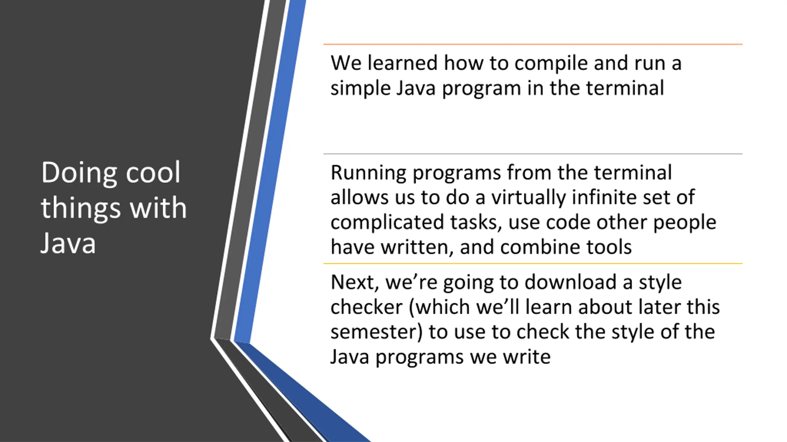 We learned how to compile and run a simple Java program in the terminal Doing cool things with Java Running programs from the terminal allows us to do a virtually infinite set of complicated tasks, use code other people have written, and combine tools Next, we re going to download a style checker (which we ll learn about later this semester) to use to check the style of the Java programs we write