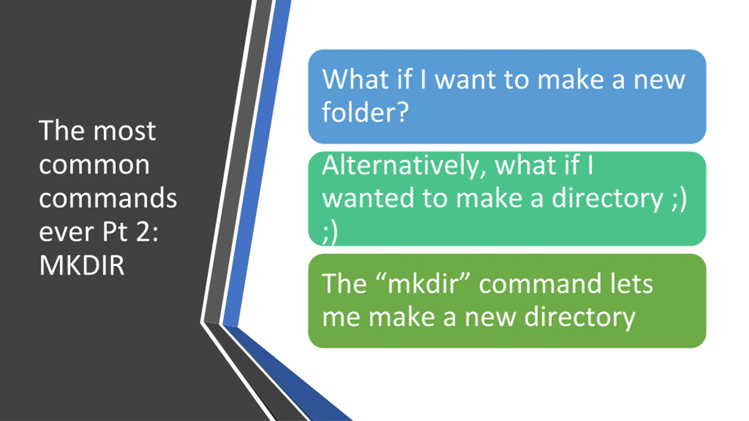 What if I want to make a new folder? The most common commands ever Pt 2: MKDIR Alternatively, what if I wanted to make a directory ;) ;) The mkdir command lets me make a new directory