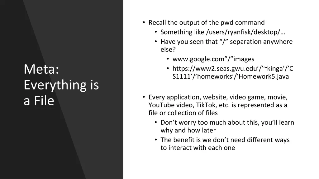 Recall the output of the pwd command Something like /users/ryanfisk/desktop/ Have you seen that / separation anywhere else? www.google.com / images https://www2.seas.gwu.edu / ~kinga / C S1111 / homeworks / Homework5.java Meta: Everything is a File Every application, website, video game, movie, YouTube video, TikTok, etc. is represented as a file or collection of files Don t worry too much about this, you ll learn why and how later The benefit is we don t need different ways to interact with each one