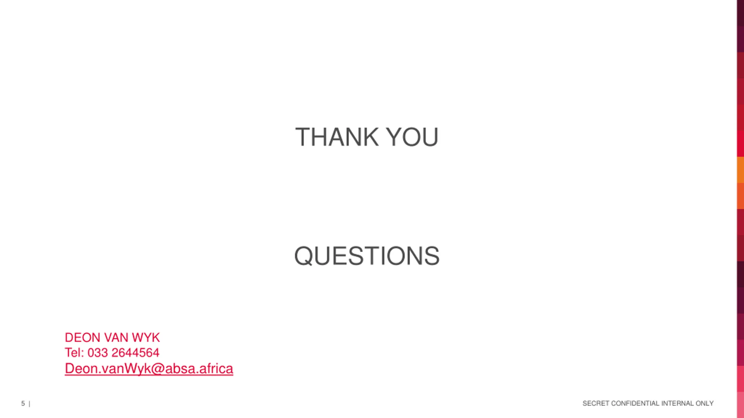 THANK YOU QUESTIONS DEON VAN WYK Tel: 033 2644564 Deon.vanWyk@absa.africa 5 | SECRET CONFIDENTIAL INTERNAL ONLY