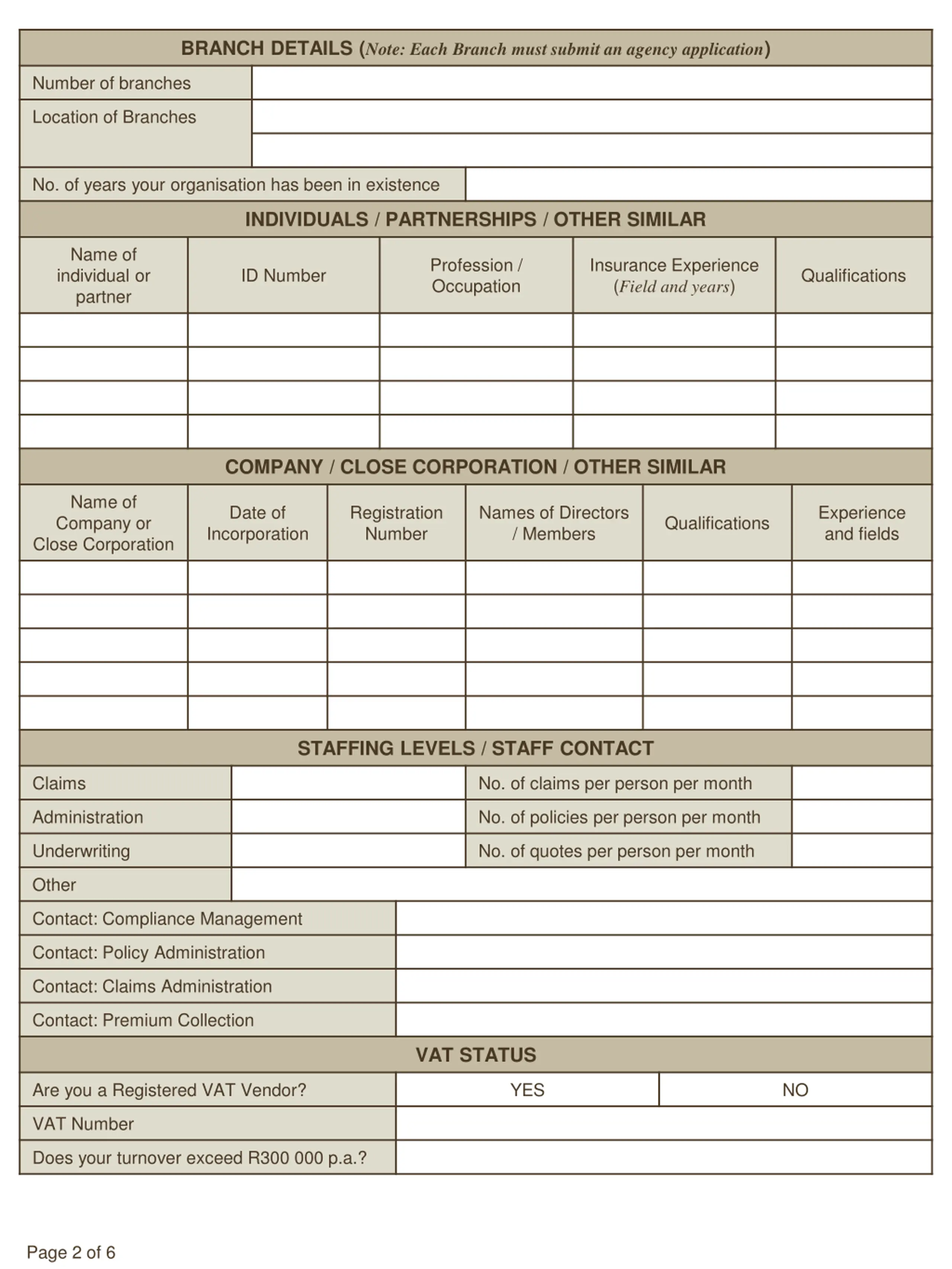 BRANCH DETAILS (Note: Each Branch must submit an agency application) Number of branches Location of Branches No. of years your organisation has been in existence INDIVIDUALS / PARTNERSHIPS / OTHER SIMILAR Name of individual or partner Profession / Occupation Insurance Experience (Field and years) ID Number Qualifications COMPANY / CLOSE CORPORATION / OTHER SIMILAR Name of Company or Close Corporation Date of Incorporation Registration Number Names of Directors / Members Experience and fields Qualifications STAFFING LEVELS / STAFF CONTACT Claims No. of claims per person per month Administration No. of policies per person per month Underwriting No. of quotes per person per month Other Contact: Compliance Management Contact: Policy Administration Contact: Claims Administration Contact: Premium Collection VAT STATUS Are you a Registered VAT Vendor? YES NO VAT Number Does your turnover exceed R300 000 p.a.? Page 2 of 6