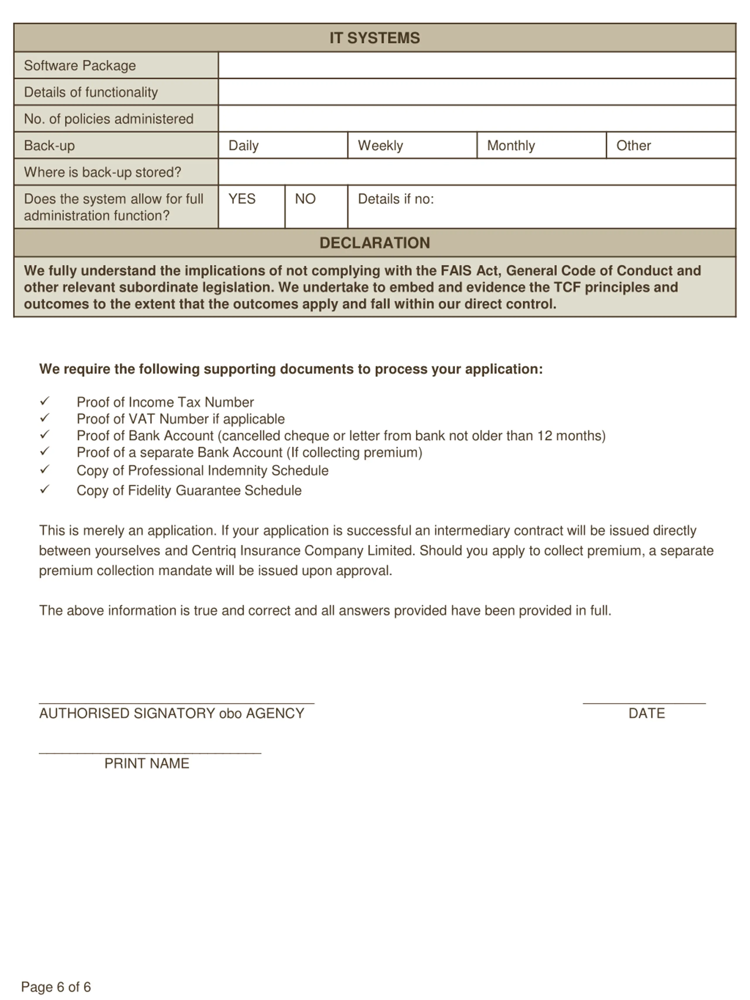 IT SYSTEMS Software Package Details of functionality No. of policies administered Back-up Daily Weekly Monthly Other Where is back-up stored? Does the system allow for full administration function? YES NO Details if no: DECLARATION We fully understand the implications of not complying with the FAIS Act, General Code of Conduct and other relevant subordinate legislation. We undertake to embed and evidence the TCF principles and outcomes to the extent that the outcomes apply and fall within our direct control. We require the following supporting documents to process your application: Proof of Income Tax Number Proof of VAT Number if applicable Proof of Bank Account (cancelled cheque or letter from bank not older than 12 months) Proof of a separate Bank Account (If collecting premium) Copy of Professional Indemnity Schedule Copy of Fidelity Guarantee Schedule This is merely an application. If your application is successful an intermediary contract will be issued directly between yourselves and Centriq Insurance Company Limited. Should you apply to collect premium, a separate premium collection mandate will be issued upon approval. The above information is true and correct and all answers provided have been provided in full. ____________________________________ AUTHORISED SIGNATORY obo AGENCY ________________ DATE _____________________________ PRINT NAME Page 6 of 6