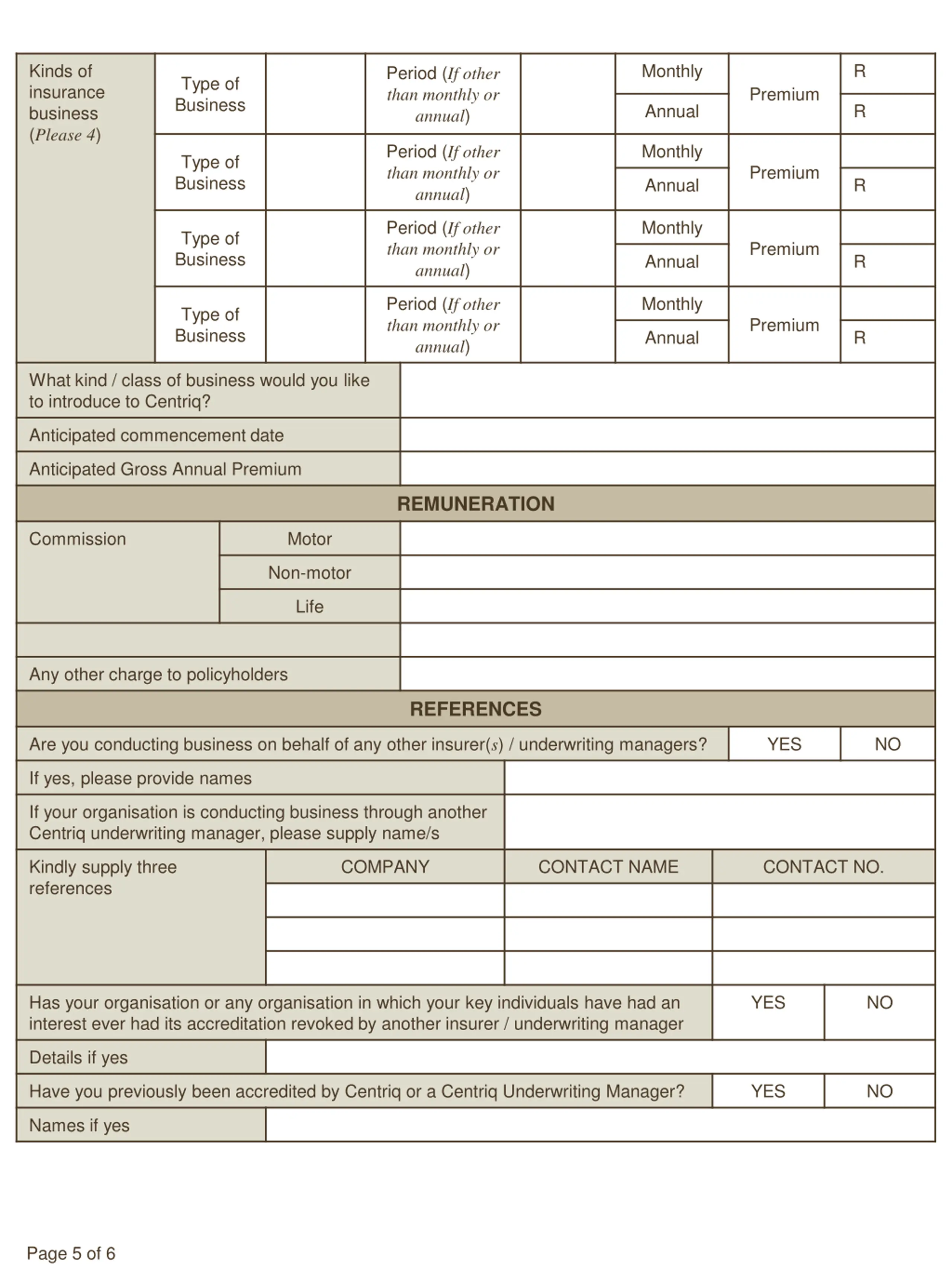 Kinds of insurance business (Please 4) Monthly R Period (If other than monthly or annual) Type of Business Premium Annual R Period (If other than monthly or annual) Monthly Type of Business Premium Annual R Period (If other than monthly or annual) Monthly Type of Business Premium Annual R Period (If other than monthly or annual) Monthly Type of Business Premium Annual R What kind / class of business would you like to introduce to Centriq? Anticipated commencement date Anticipated Gross Annual Premium REMUNERATION Commission Motor Non-motor Life Any other charge to policyholders REFERENCES Are you conducting business on behalf of any other insurer(s) / underwriting managers? YES NO If yes, please provide names If your organisation is conducting business through another Centriq underwriting manager, please supply name/s Kindly supply three references COMPANY CONTACT NAME CONTACT NO. Has your organisation or any organisation in which your key individuals have had an interest ever had its accreditation revoked by another insurer / underwriting manager YES NO Details if yes Have you previously been accredited by Centriq or a Centriq Underwriting Manager? YES NO Names if yes Page 5 of 6