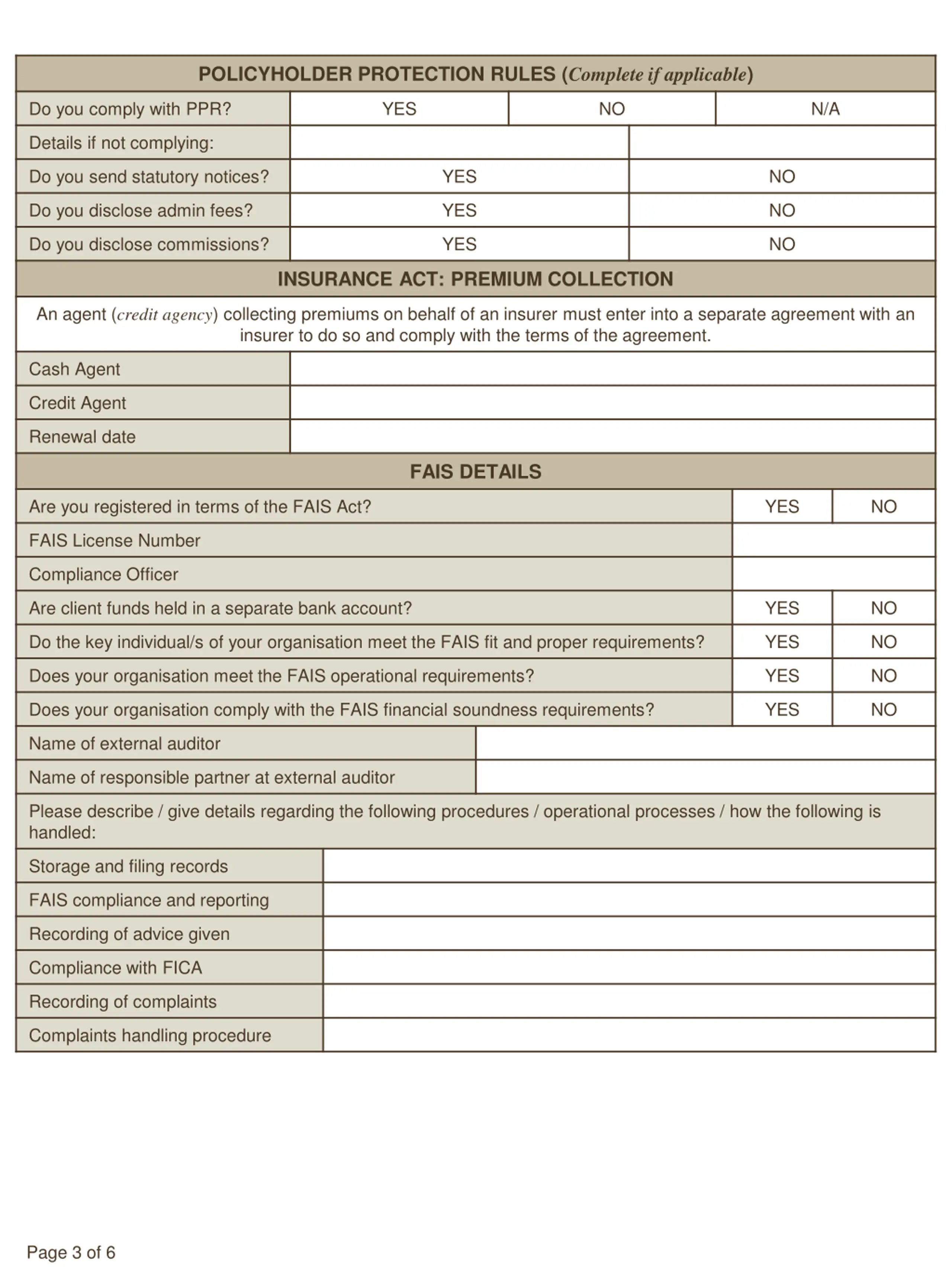 POLICYHOLDER PROTECTION RULES (Complete if applicable) Do you comply with PPR? YES NO N/A Details if not complying: Do you send statutory notices? YES NO Do you disclose admin fees? YES NO Do you disclose commissions? YES NO INSURANCE ACT: PREMIUM COLLECTION An agent (credit agency) collecting premiums on behalf of an insurer must enter into a separate agreement with an insurer to do so and comply with the terms of the agreement. Cash Agent Credit Agent Renewal date FAIS DETAILS Are you registered in terms of the FAIS Act? YES NO FAIS License Number Compliance Officer Are client funds held in a separate bank account? YES NO Do the key individual/s of your organisation meet the FAIS fit and proper requirements? YES NO Does your organisation meet the FAIS operational requirements? YES NO Does your organisation comply with the FAIS financial soundness requirements? YES NO Name of external auditor Name of responsible partner at external auditor Please describe / give details regarding the following procedures / operational processes / how the following is handled: Storage and filing records FAIS compliance and reporting Recording of advice given Compliance with FICA Recording of complaints Complaints handling procedure Page 3 of 6