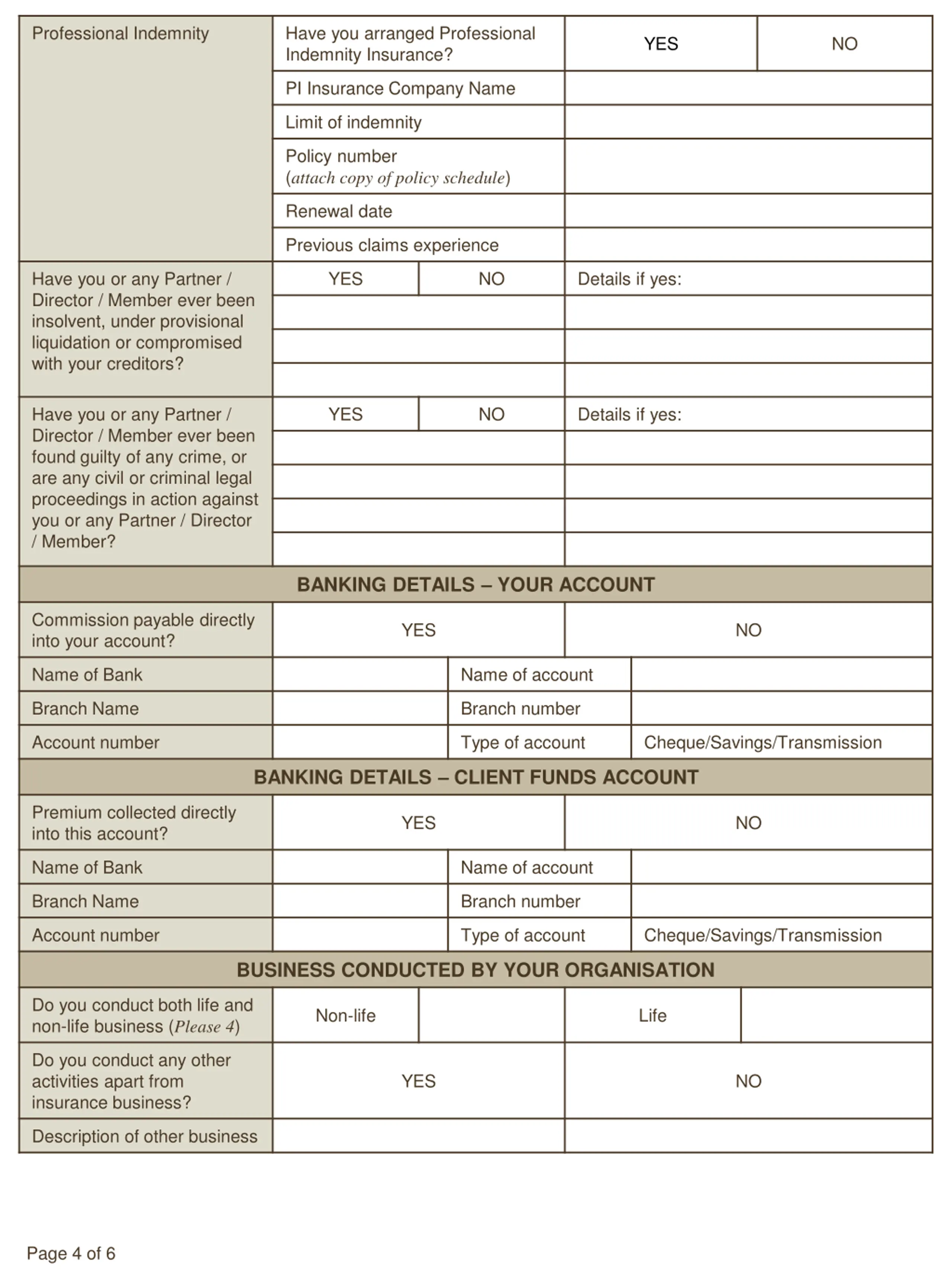 Professional Indemnity Have you arranged Professional Indemnity Insurance? YES NO PI Insurance Company Name Limit of indemnity Policy number (attach copy of policy schedule) Renewal date Previous claims experience Have you or any Partner / Director / Member ever been insolvent, under provisional liquidation or compromised with your creditors? YES NO Details if yes: Have you or any Partner / Director / Member ever been found guilty of any crime, or are any civil or criminal legal proceedings in action against you or any Partner / Director / Member? YES NO Details if yes: BANKING DETAILS YOUR ACCOUNT Commission payable directly into your account? YES NO Name of Bank Name of account Branch Name Branch number Account number Type of account Cheque/Savings/Transmission BANKING DETAILS CLIENT FUNDS ACCOUNT Premium collected directly into this account? YES NO Name of Bank Name of account Branch Name Branch number Account number Type of account Cheque/Savings/Transmission BUSINESS CONDUCTED BY YOUR ORGANISATION Do you conduct both life and non-life business (Please 4) Non-life Life Do you conduct any other activities apart from insurance business? YES NO Description of other business Page 4 of 6