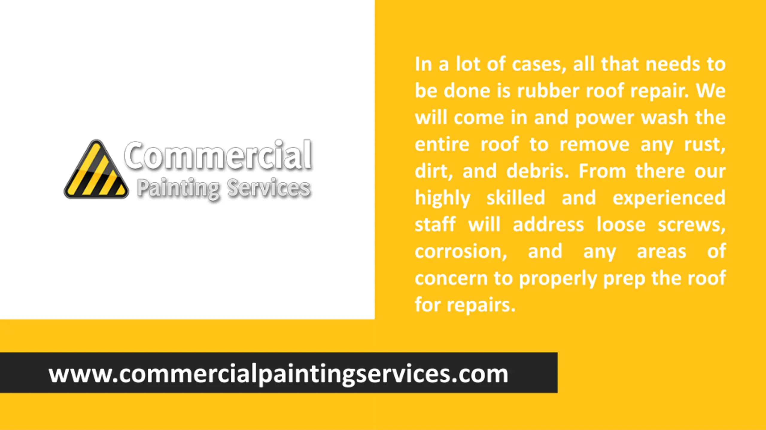In a lot of cases, all that needs to be done is rubber roof repair. We will come in and power wash the entire roof to remove any rust, dirt, and debris. From there our highly skilled and experienced staff will address loose screws, corrosion, and any areas of concern to properly prep the roof for repairs. www.commercialpaintingservices.com