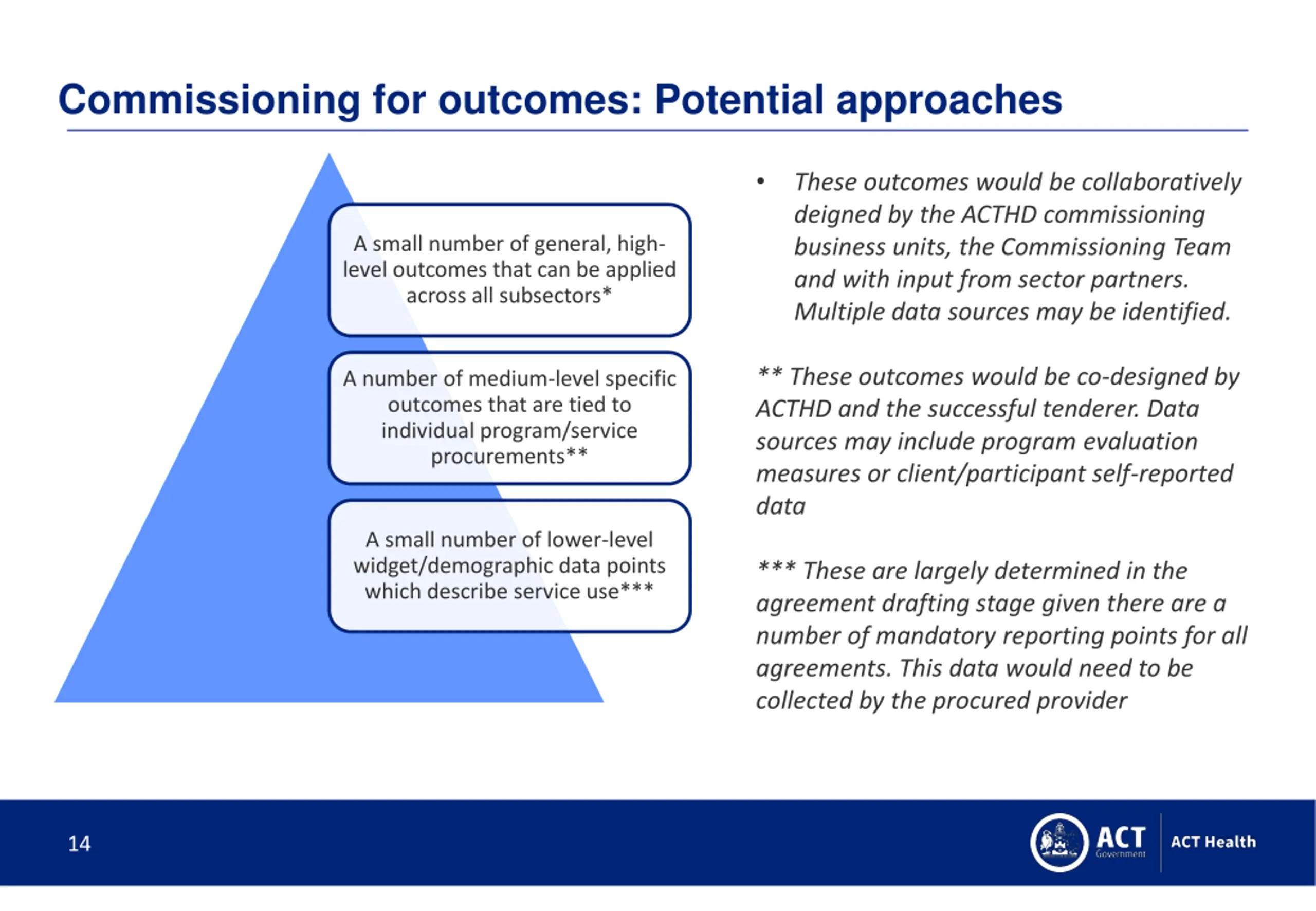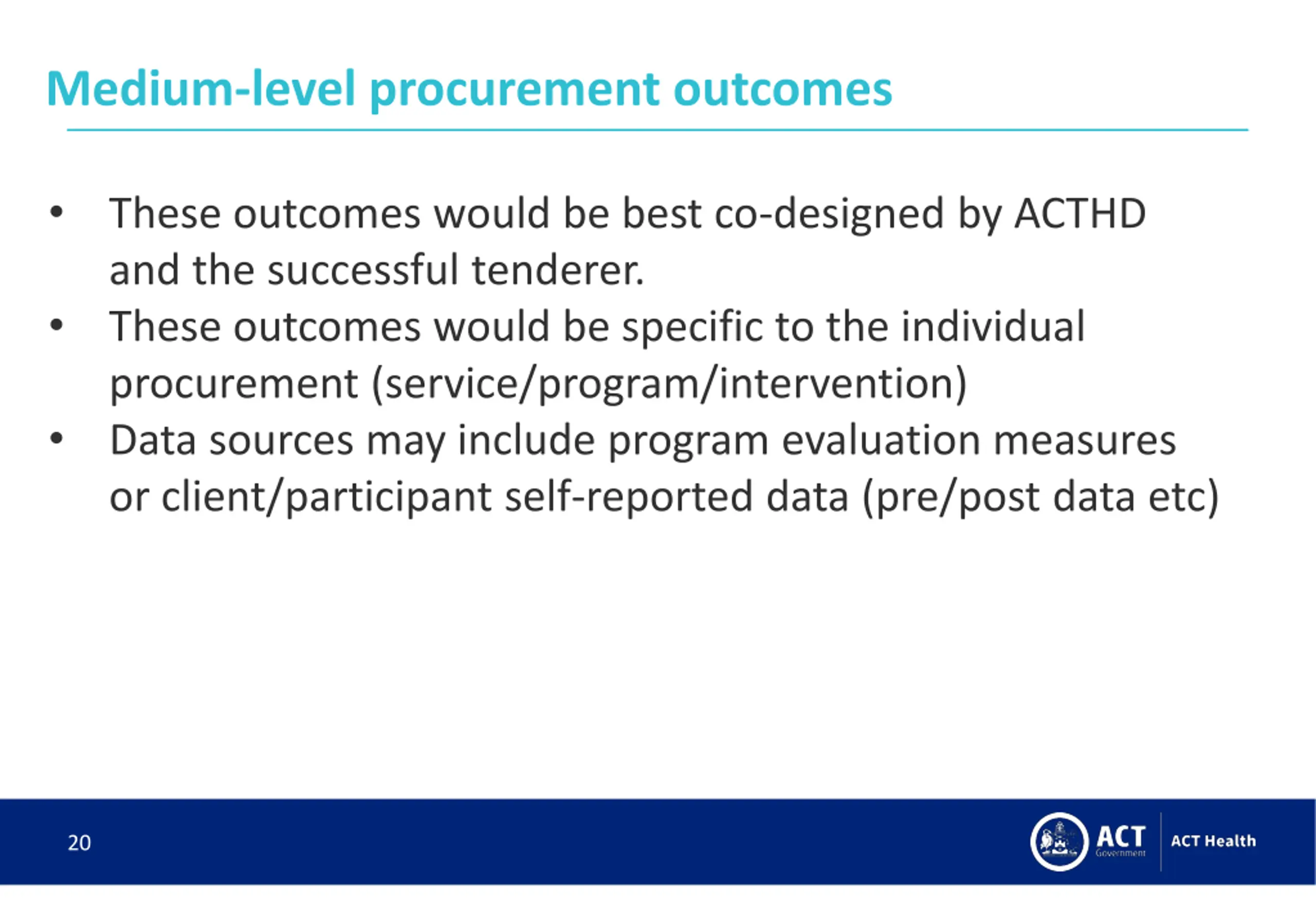 Medium-level procurement outcomes These outcomes would be best co-designed by ACTHD and the successful tenderer. These outcomes would be specific to the individual procurement (service/program/intervention) Data sources may include program evaluation measures or client/participant self-reported data (pre/post data etc) 20