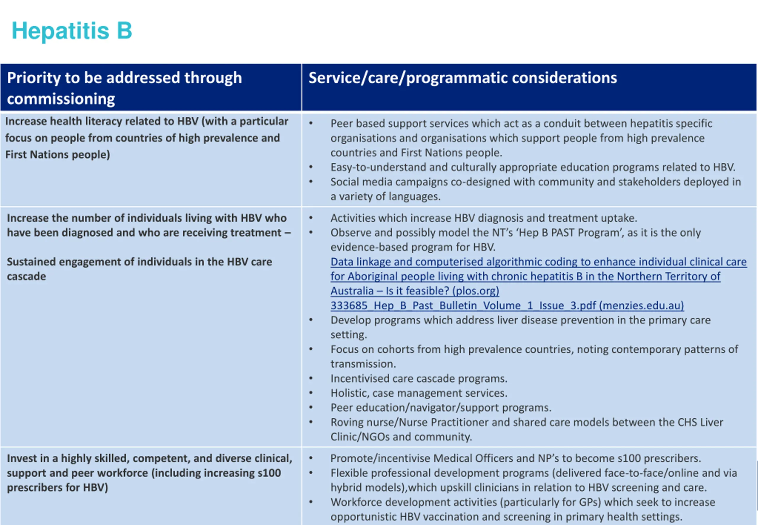 Hepatitis B Priority to be addressed through commissioning Service/care/programmatic considerations Increase health literacy related to HBV (with a particular focus on people from countries of high prevalence and First Nations people) Peer based support services which act as a conduit between hepatitis specific organisations and organisations which support people from high prevalence countries and First Nations people. Easy-to-understand and culturally appropriate education programs related to HBV. Social media campaigns co-designed with community and stakeholders deployed in a variety of languages. Increase the number of individuals living with HBV who have been diagnosed and who are receiving treatment Activities which increase HBV diagnosis and treatment uptake. Observe and possibly model the NT s Hep B PAST Program , as it is the only evidence-based program for HBV. Data linkage and computerised algorithmic coding to enhance individual clinical care for Aboriginal people living with chronic hepatitis B in the Northern Territory of Australia Is it feasible? (plos.org) 333685_Hep_B_Past_Bulletin_Volume_1_Issue_3.pdf (menzies.edu.au) Develop programs which address liver disease prevention in the primary care setting. Focus on cohorts from high prevalence countries, noting contemporary patterns of transmission. Incentivised care cascade programs. Holistic, case management services. Peer education/navigator/support programs. Roving nurse/Nurse Practitioner and shared care models between the CHS Liver Clinic/NGOs and community. Sustained engagement of individuals in the HBV care cascade Promote/incentivise Medical Officers and NP s to become s100 prescribers. Flexible professional development programs (delivered face-to-face/online and via hybrid models),which upskill clinicians in relation to HBV screening and care. Workforce development activities (particularly for GPs) which seek to increase opportunistic HBV vaccination and screening in primary health settings. Invest in a highly skilled, competent, and diverse clinical, support and peer workforce (including increasing s100 prescribers for HBV) 6
