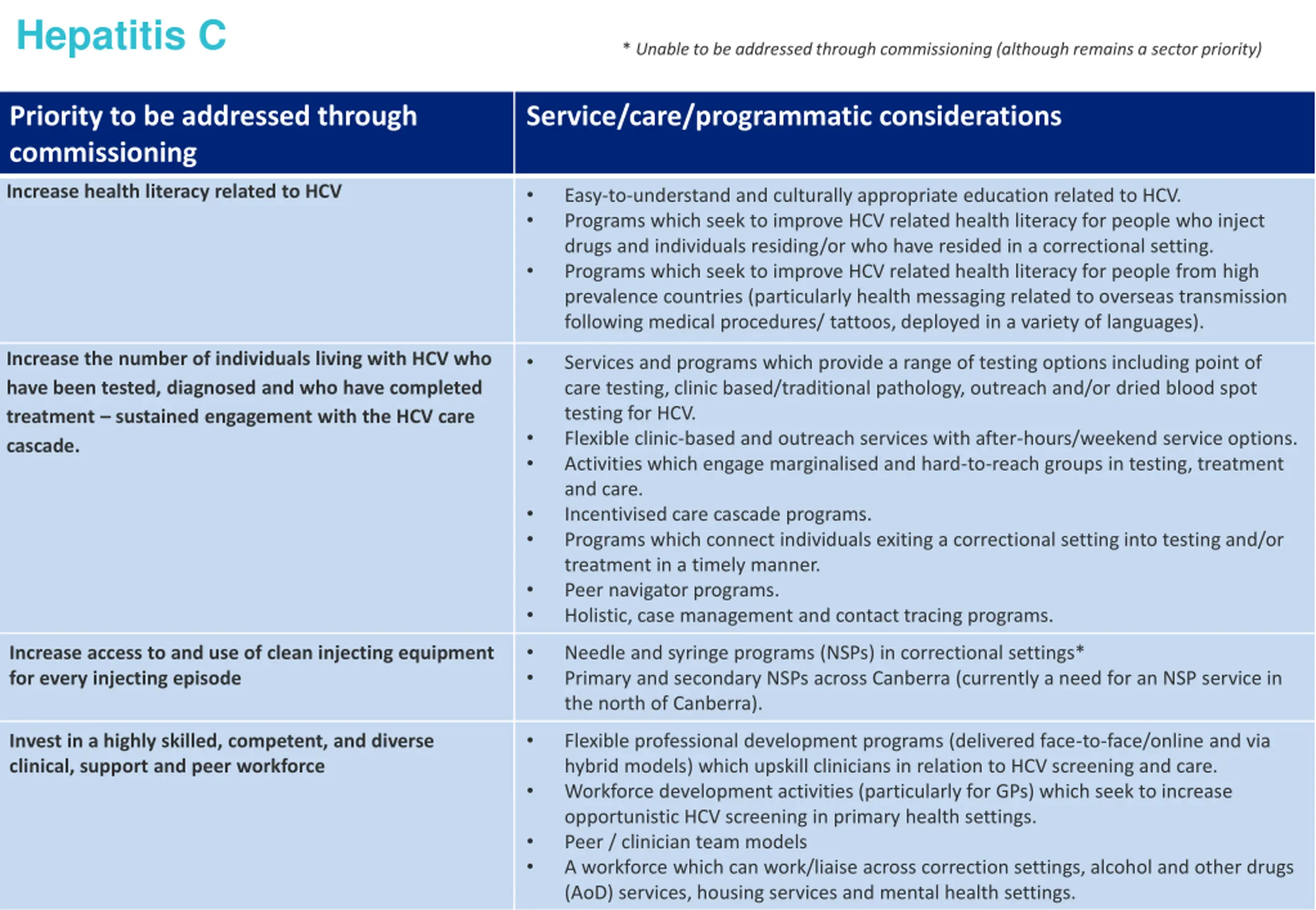 Hepatitis C * Unable to be addressed through commissioning (although remains a sector priority) Priority to be addressed through commissioning Service/care/programmatic considerations Increase health literacy related to HCV Easy-to-understand and culturally appropriate education related to HCV. Programs which seek to improve HCV related health literacy for people who inject drugs and individuals residing/or who have resided in a correctional setting. Programs which seek to improve HCV related health literacy for people from high prevalence countries (particularly health messaging related to overseas transmission following medical procedures/ tattoos, deployed in a variety of languages). Increase the number of individuals living with HCV who have been tested, diagnosed and who have completed treatment sustained engagement with the HCV care cascade. Services and programs which provide a range of testing options including point of care testing, clinic based/traditional pathology, outreach and/or dried blood spot testing for HCV. Flexible clinic-based and outreach services with after-hours/weekend service options. Activities which engage marginalised and hard-to-reach groups in testing, treatment and care. Incentivised care cascade programs. Programs which connect individuals exiting a correctional setting into testing and/or treatment in a timely manner. Peer navigator programs. Holistic, case management and contact tracing programs. Increase access to and use of clean injecting equipment for every injecting episode Needle and syringe programs (NSPs) in correctional settings* Primary and secondary NSPs across Canberra (currently a need for an NSP service in the north of Canberra). Invest in a highly skilled, competent, and diverse clinical, support and peer workforce Flexible professional development programs (delivered face-to-face/online and via hybrid models) which upskill clinicians in relation to HCV screening and care. Workforce development activities (particularly for GPs) which seek to increase opportunistic HCV screening in primary health settings. Peer / clinician team models A workforce which can work/liaise across correction settings, alcohol and other drugs (AoD) services, housing services and mental health settings. 7