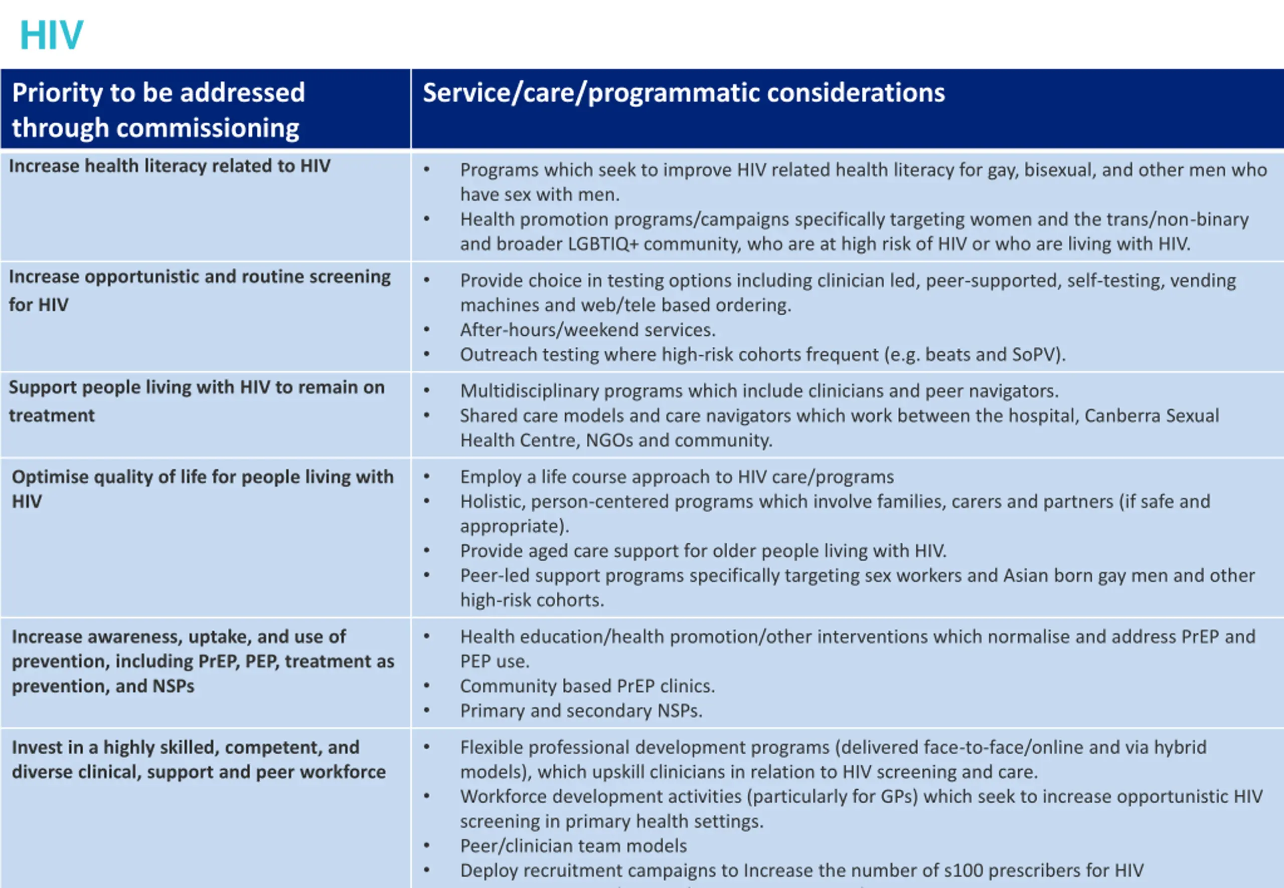 HIV Priority to be addressed through commissioning Service/care/programmatic considerations Increase health literacy related to HIV Programs which seek to improve HIV related health literacy for gay, bisexual, and other men who have sex with men. Health promotion programs/campaigns specifically targeting women and the trans/non-binary and broader LGBTIQ+ community, who are at high risk of HIV or who are living with HIV. Increase opportunistic and routine screening for HIV Provide choice in testing options including clinician led, peer-supported, self-testing, vending machines and web/tele based ordering. After-hours/weekend services. Outreach testing where high-risk cohorts frequent (e.g. beats and SoPV). Support people living with HIV to remain on treatment Multidisciplinary programs which include clinicians and peer navigators. Shared care models and care navigators which work between the hospital, Canberra Sexual Health Centre, NGOs and community. Optimise quality of life for people living with HIV Employ a life course approach to HIV care/programs Holistic, person-centered programs which involve families, carers and partners (if safe and appropriate). Provide aged care support for older people living with HIV. Peer-led support programs specifically targeting sex workers and Asian born gay men and other high-risk cohorts. Increase awareness, uptake, and use of prevention, including PrEP, PEP, treatment as prevention, and NSPs Health education/health promotion/other interventions which normalise and address PrEP and PEP use. Community based PrEP clinics. Primary and secondary NSPs. Invest in a highly skilled, competent, and diverse clinical, support and peer workforce Flexible professional development programs (delivered face-to-face/online and via hybrid models), which upskill clinicians in relation to HIV screening and care. Workforce development activities (particularly for GPs) which seek to increase opportunistic HIV screening in primary health settings. Peer/clinician team models Deploy recruitment campaigns to Increase the number of s100 prescribers for HIV Incentivise GPs and NPS to become s100 prescribers 8