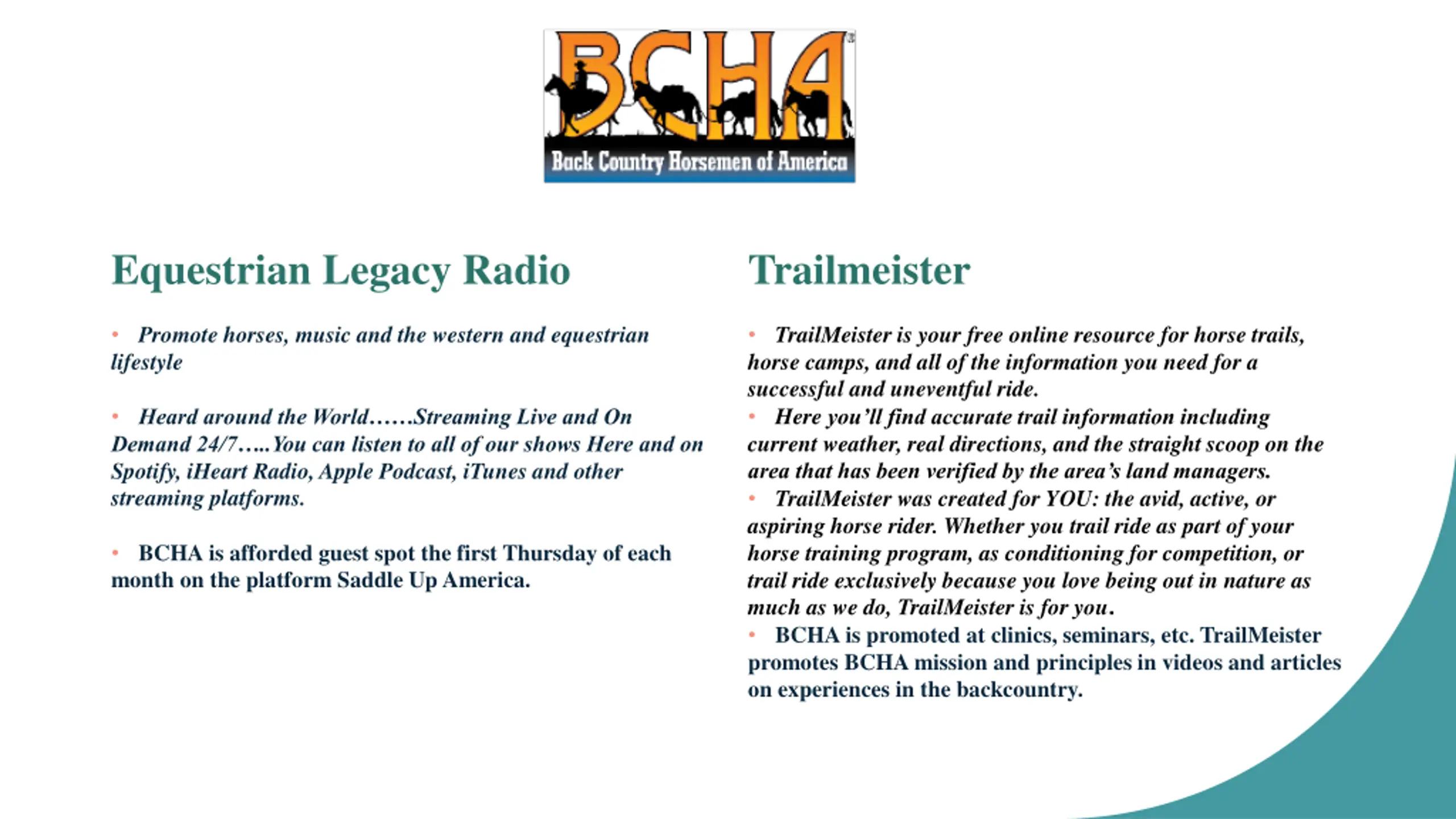 . Equestrian Legacy Radio Trailmeister Promote horses, music and the western and equestrian lifestyle TrailMeister is your free online resource for horse trails, horse camps, and all of the information you need for a successful and uneventful ride. Here you ll find accurate trail information including current weather, real directions, and the straight scoop on the area that has been verified by the area s land managers. TrailMeister was created for YOU: the avid, active, or aspiring horse rider. Whether you trail ride as part of your horse training program, as conditioning for competition, or trail ride exclusively because you love being out in nature as much as we do, TrailMeister is for you. BCHA is promoted at clinics, seminars, etc. TrailMeister promotes BCHA mission and principles in videos and articles on experiences in the backcountry. Heard around the World Streaming Live and On Demand 24/7 ..You can listen to all of our shows Here and on Spotify, iHeart Radio, Apple Podcast, iTunes and other streaming platforms. BCHA is afforded guest spot the first Thursday of each month on the platform Saddle Up America.
