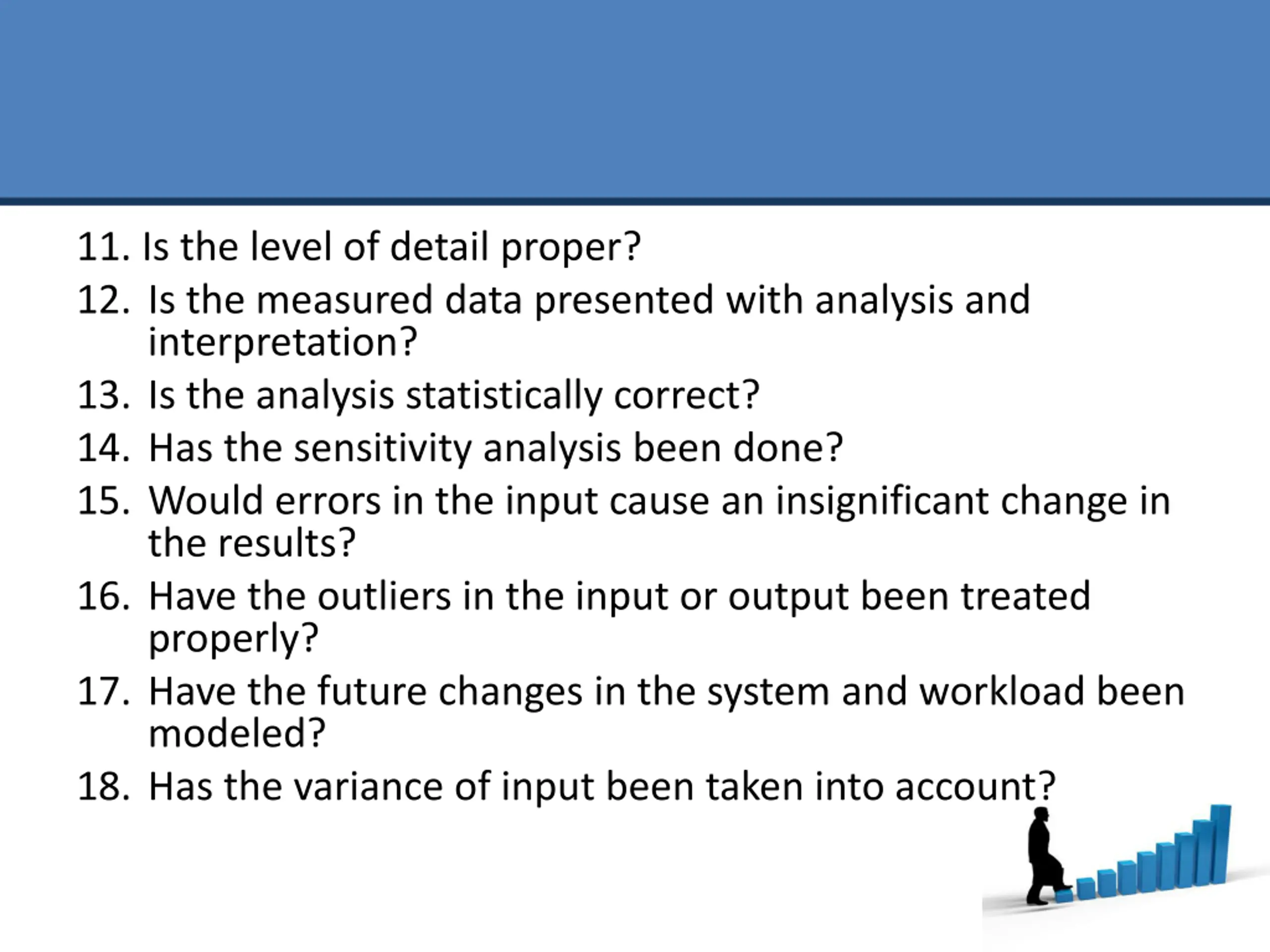 11. Is the level of detail proper? 12. Is the measured data presented with analysis and interpretation? 13. Is the analysis statistically correct? 14. Has the sensitivity analysis been done? 15. Would errors in the input cause an insignificant change in the results? 16. Have the outliers in the input or output been treated properly? 17. Have the future changes in the system and workload been modeled? 18. Has the variance of input been taken into account?