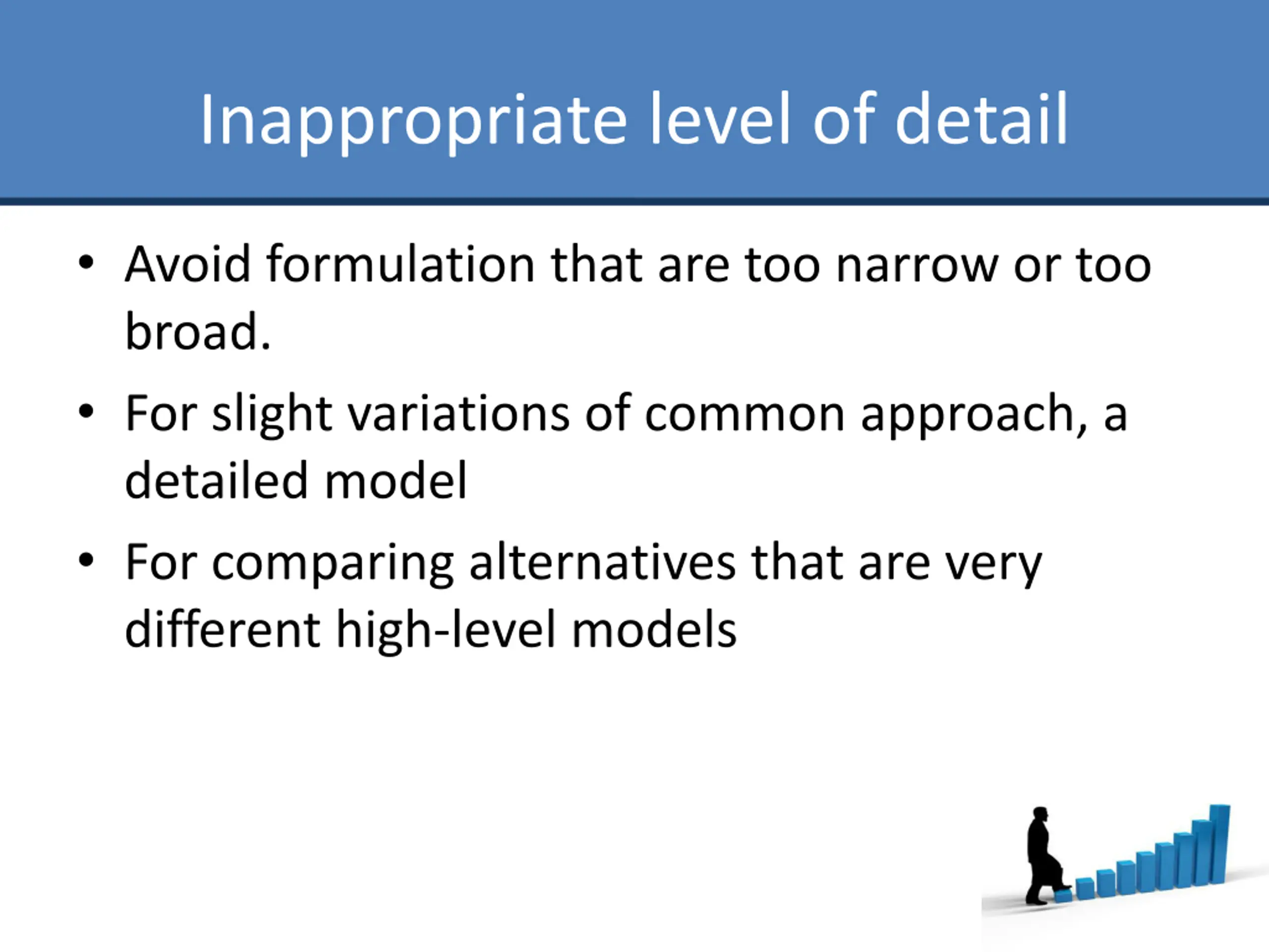 Inappropriate level of detail Avoid formulation that are too narrow or too broad. For slight variations of common approach, a detailed model For comparing alternatives that are very different high-level models