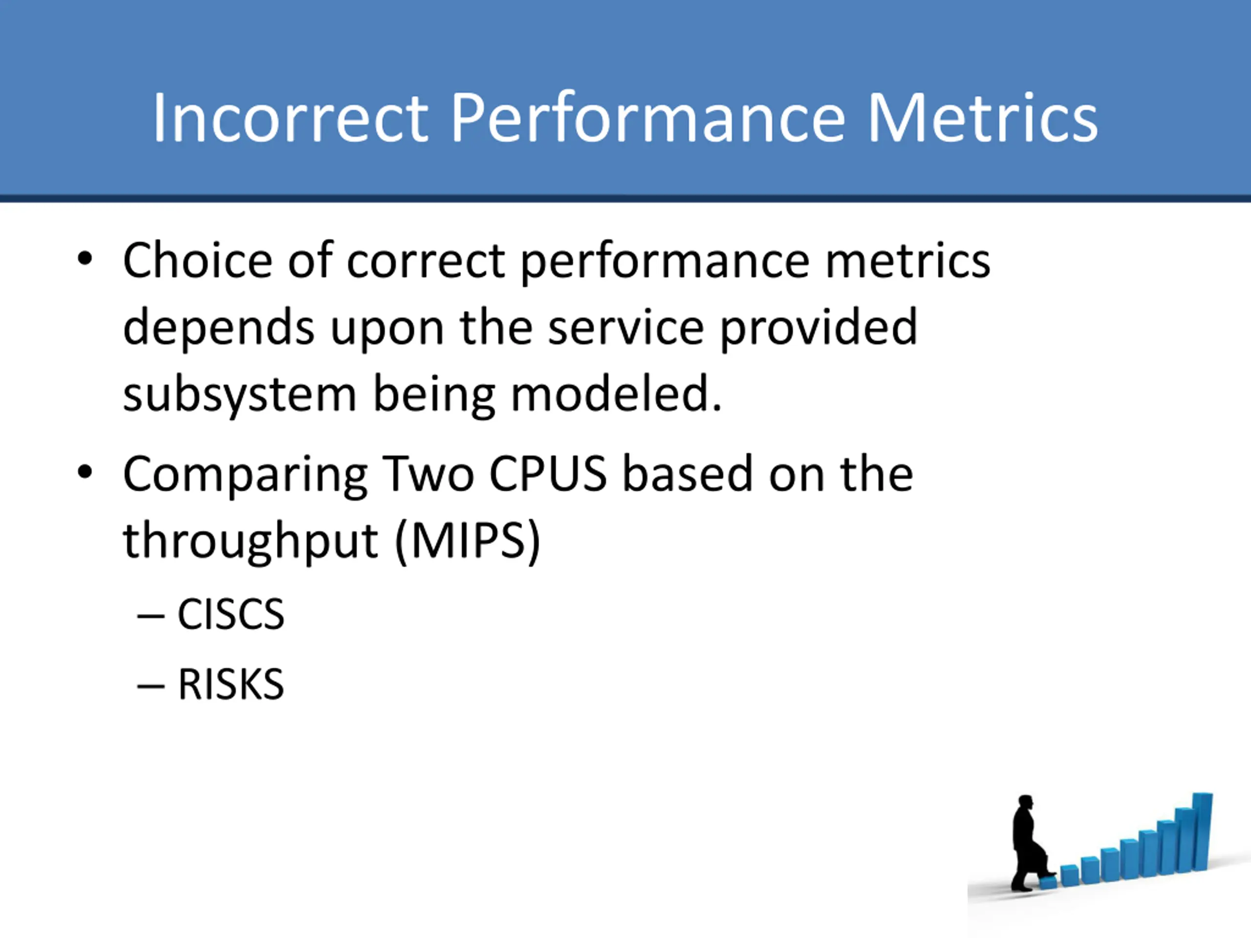 Incorrect Performance Metrics Choice of correct performance metrics depends upon the service provided subsystem being modeled. Comparing Two CPUS based on the throughput (MIPS) CISCS RISKS