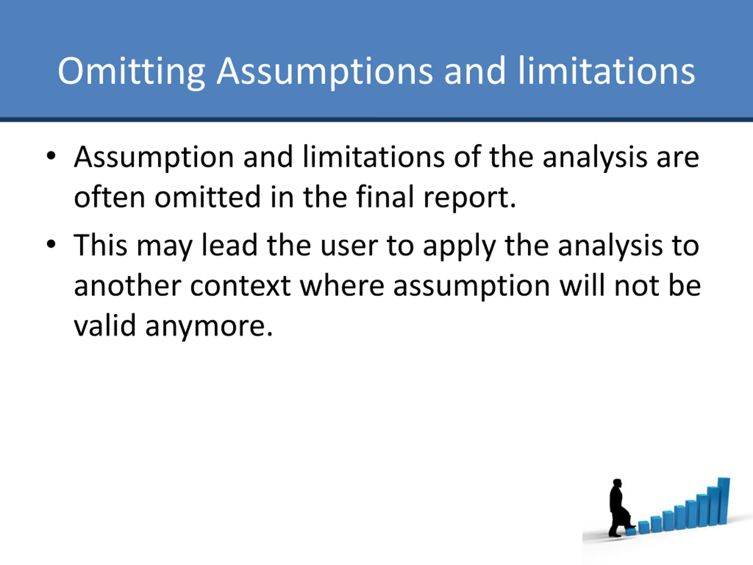 Omitting Assumptions and limitations Assumption and limitations of the analysis are often omitted in the final report. This may lead the user to apply the analysis to another context where assumption will not be valid anymore.