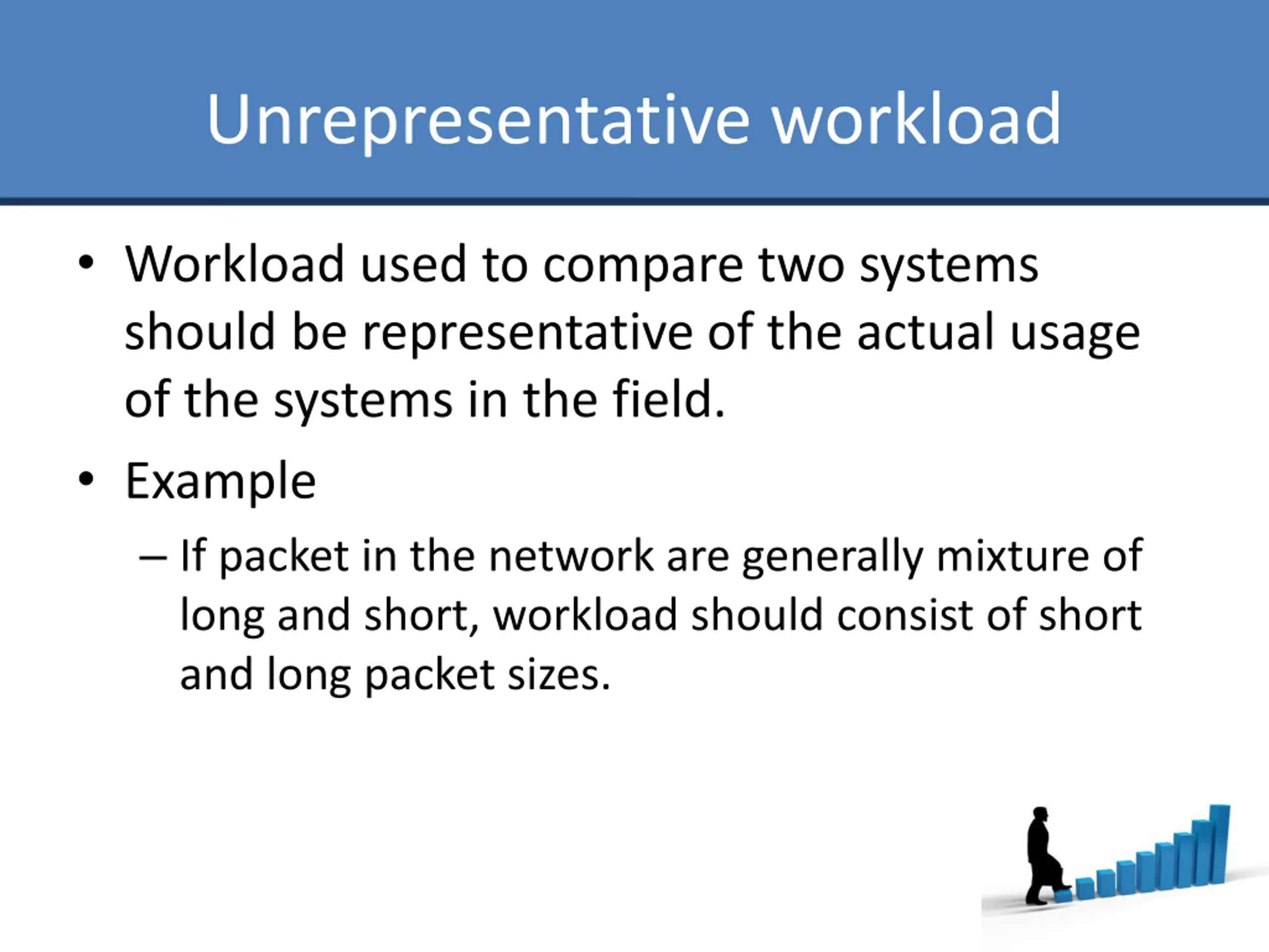 Unrepresentative workload Workload used to compare two systems should be representative of the actual usage of the systems in the field. Example If packet in the network are generally mixture of long and short, workload should consist of short and long packet sizes.