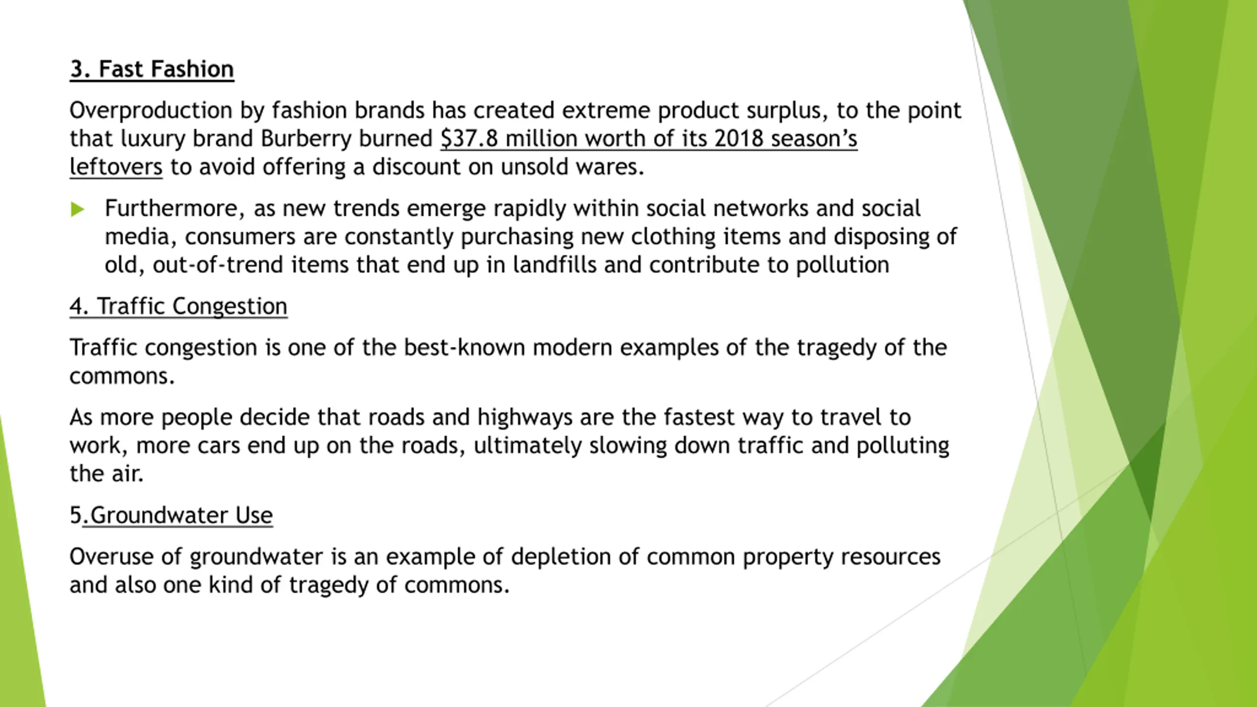 3. Fast Fashion Overproduction by fashion brands has created extreme product surplus, to the point that luxury brand Burberry burned $37.8 million worth of its 2018 season s leftovers to avoid offering a discount on unsold wares. Furthermore, as new trends emerge rapidly within social networks and social media, consumers are constantly purchasing new clothing items and disposing of old, out-of-trend items that end up in landfills and contribute to pollution 4. Traffic Congestion Traffic congestion is one of the best-known modern examples of the tragedy of the commons. As more people decide that roads and highways are the fastest way to travel to work, more cars end up on the roads, ultimately slowing down traffic and polluting the air. 5.Groundwater Use Overuse of groundwater is an example of depletion of common property resources and also one kind of tragedy of commons.