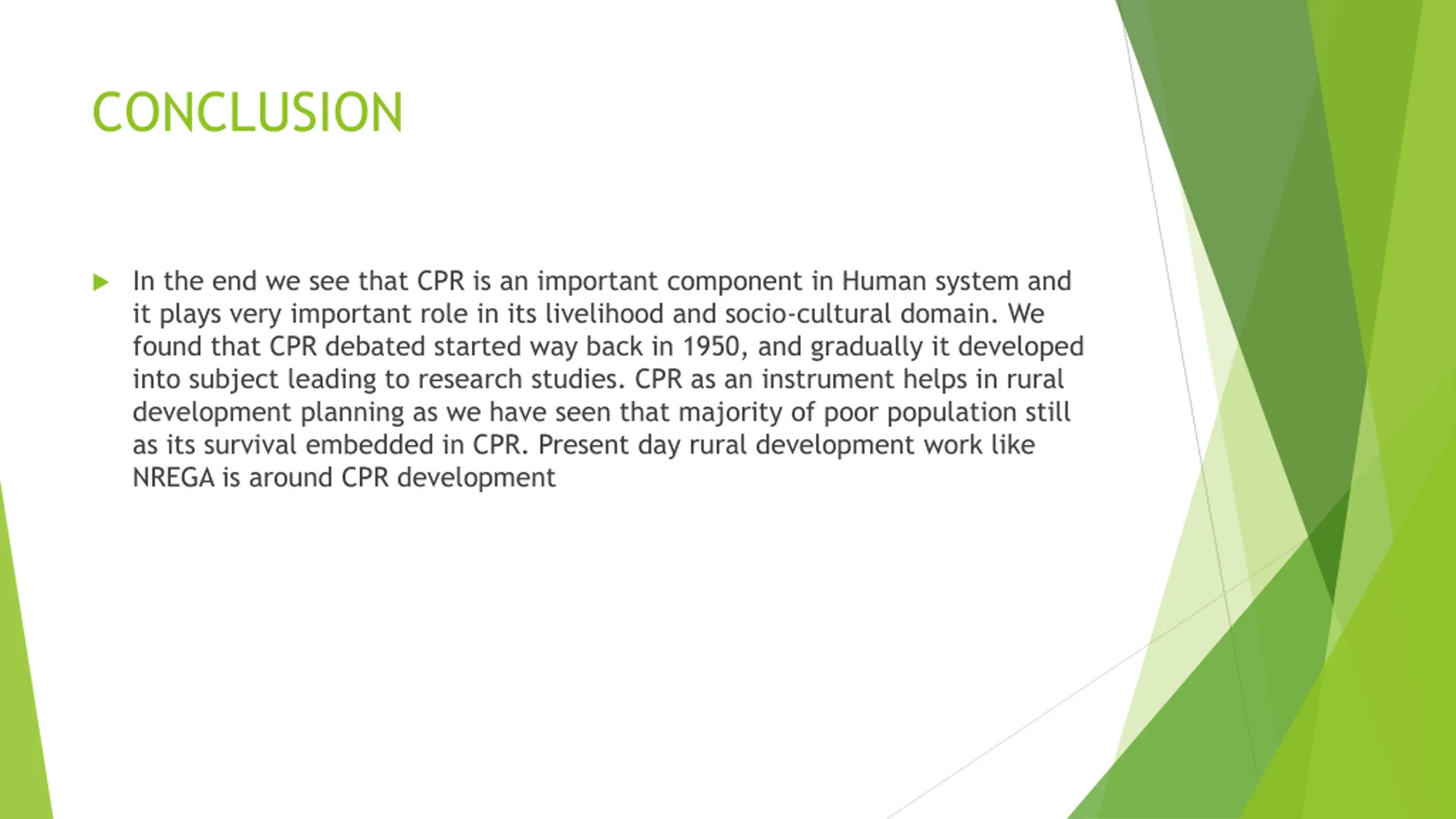 CONCLUSION In the end we see that CPR is an important component in Human system and it plays very important role in its livelihood and socio-cultural domain. We found that CPR debated started way back in 1950, and gradually it developed into subject leading to research studies. CPR as an instrument helps in rural development planning as we have seen that majority of poor population still as its survival embedded in CPR. Present day rural development work like NREGA is around CPR development