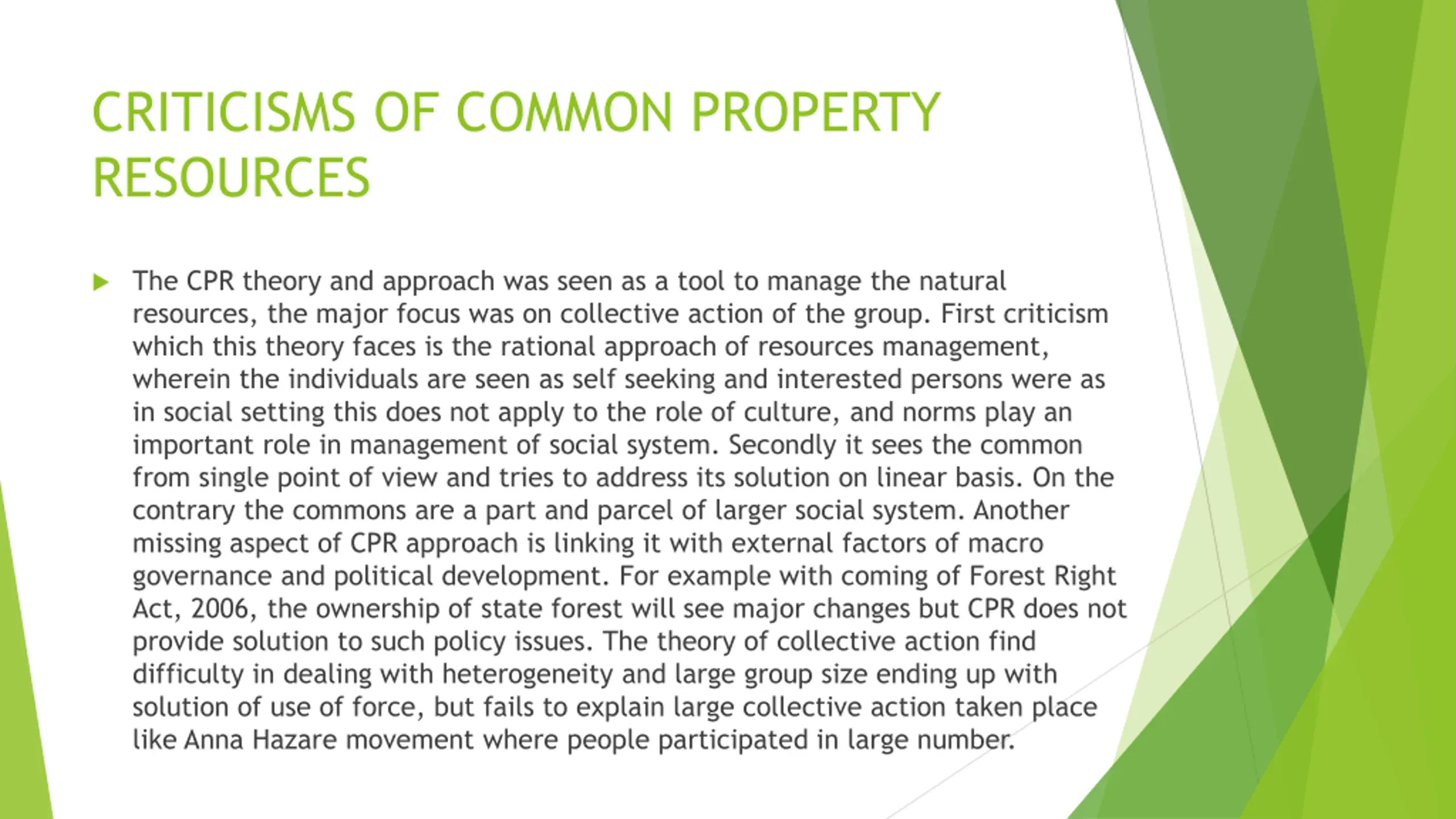 CRITICISMS OF COMMON PROPERTY RESOURCES The CPR theory and approach was seen as a tool to manage the natural resources, the major focus was on collective action of the group. First criticism which this theory faces is the rational approach of resources management, wherein the individuals are seen as self seeking and interested persons were as in social setting this does not apply to the role of culture, and norms play an important role in management of social system. Secondly it sees the common from single point of view and tries to address its solution on linear basis. On the contrary the commons are a part and parcel of larger social system. Another missing aspect of CPR approach is linking it with external factors of macro governance and political development. For example with coming of Forest Right Act, 2006, the ownership of state forest will see major changes but CPR does not provide solution to such policy issues. The theory of collective action find difficulty in dealing with heterogeneity and large group size ending up with solution of use of force, but fails to explain large collective action taken place like Anna Hazare movement where people participated in large number.
