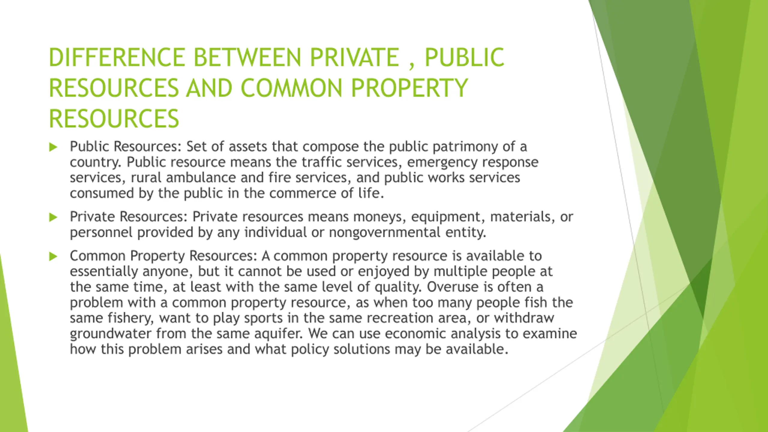 DIFFERENCE BETWEEN PRIVATE , PUBLIC RESOURCES AND COMMON PROPERTY RESOURCES Public Resources: Set of assets that compose the public patrimony of a country. Public resource means the traffic services, emergency response services, rural ambulance and fire services, and public works services consumed by the public in the commerce of life. Private Resources: Private resources means moneys, equipment, materials, or personnel provided by any individual or nongovernmental entity. Common Property Resources: A common property resource is available to essentially anyone, but it cannot be used or enjoyed by multiple people at the same time, at least with the same level of quality. Overuse is often a problem with a common property resource, as when too many people fish the same fishery, want to play sports in the same recreation area, or withdraw groundwater from the same aquifer. We can use economic analysis to examine how this problem arises and what policy solutions may be available.