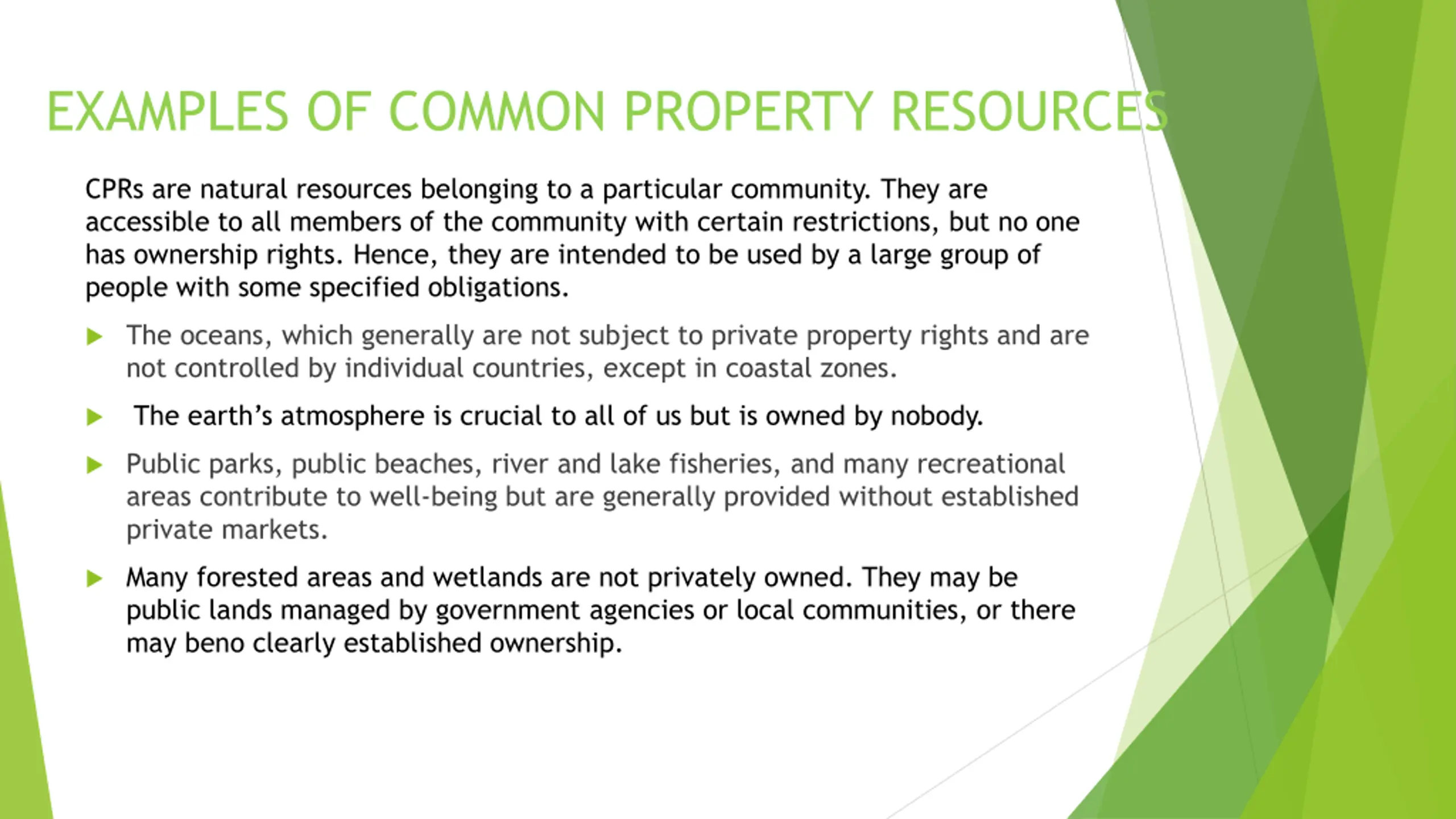 EXAMPLES OF COMMON PROPERTY RESOURCES CPRs are natural resources belonging to a particular community. They are accessible to all members of the community with certain restrictions, but no one has ownership rights. Hence, they are intended to be used by a large group of people with some specified obligations. The oceans, which generally are not subject to private property rights and are not controlled by individual countries, except in coastal zones. The earth s atmosphere is crucial to all of us but is owned by nobody. Public parks, public beaches, river and lake fisheries, and many recreational areas contribute to well-being but are generally provided without established private markets. Many forested areas and wetlands are not privately owned. They may be public lands managed by government agencies or local communities, or there may beno clearly established ownership.