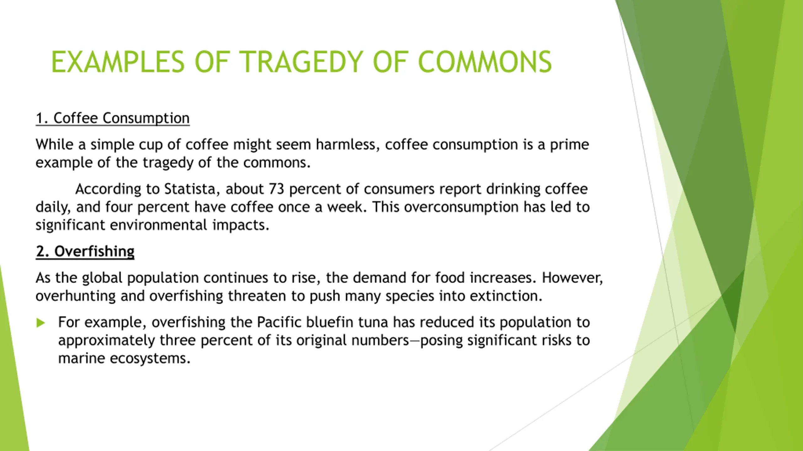 EXAMPLES OF TRAGEDY OF COMMONS 1. Coffee Consumption While a simple cup of coffee might seem harmless, coffee consumption is a prime example of the tragedy of the commons. According to Statista, about 73 percent of consumers report drinking coffee daily, and four percent have coffee once a week. This overconsumption has led to significant environmental impacts. 2. Overfishing As the global population continues to rise, the demand for food increases. However, overhunting and overfishing threaten to push many species into extinction. For example, overfishing the Pacific bluefin tuna has reduced its population to approximately three percent of its original numbers posing significant risks to marine ecosystems.