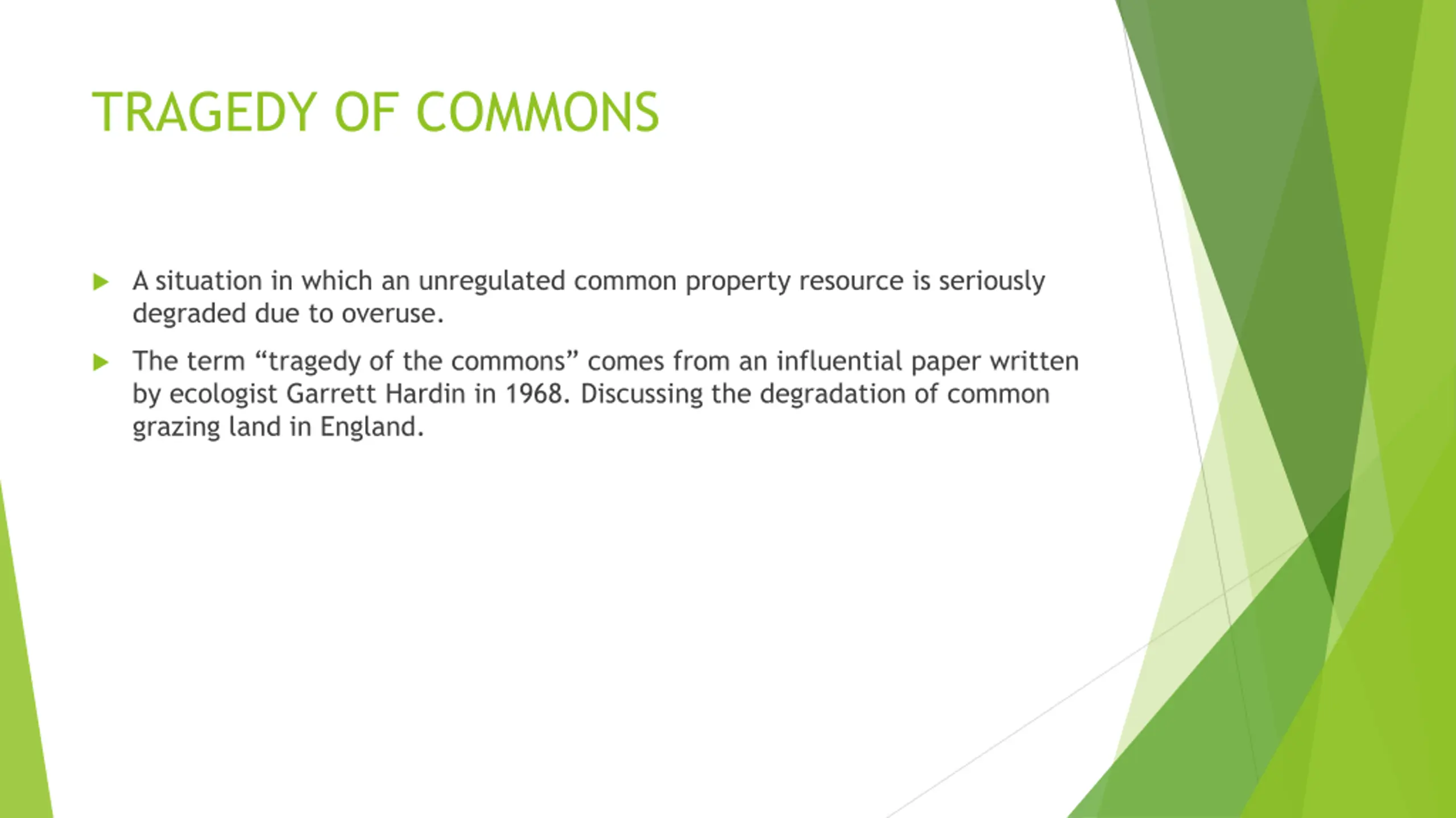 TRAGEDY OF COMMONS A situation in which an unregulated common property resource is seriously degraded due to overuse. The term tragedy of the commons comes from an influential paper written by ecologist Garrett Hardin in 1968. Discussing the degradation of common grazing land in England.