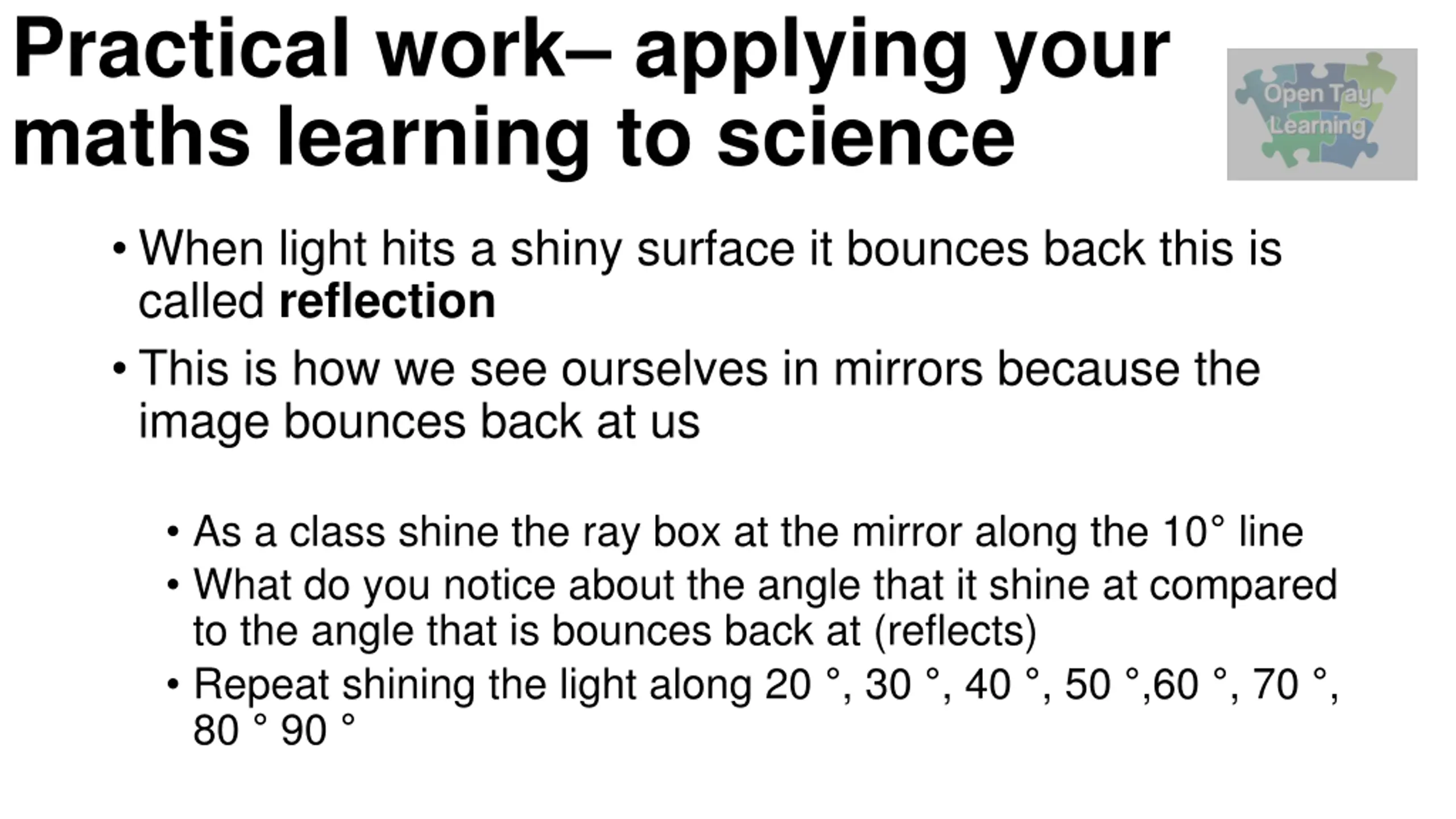 Practical work applying your maths learning to science When light hits a shiny surface it bounces back this is called reflection This is how we see ourselves in mirrors because the image bounces back at us As a class shine the ray box at the mirror along the 10 line What do you notice about the angle that it shine at compared to the angle that is bounces back at (reflects) Repeat shining the light along 20 , 30 , 40 , 50 ,60 , 70 , 80 90