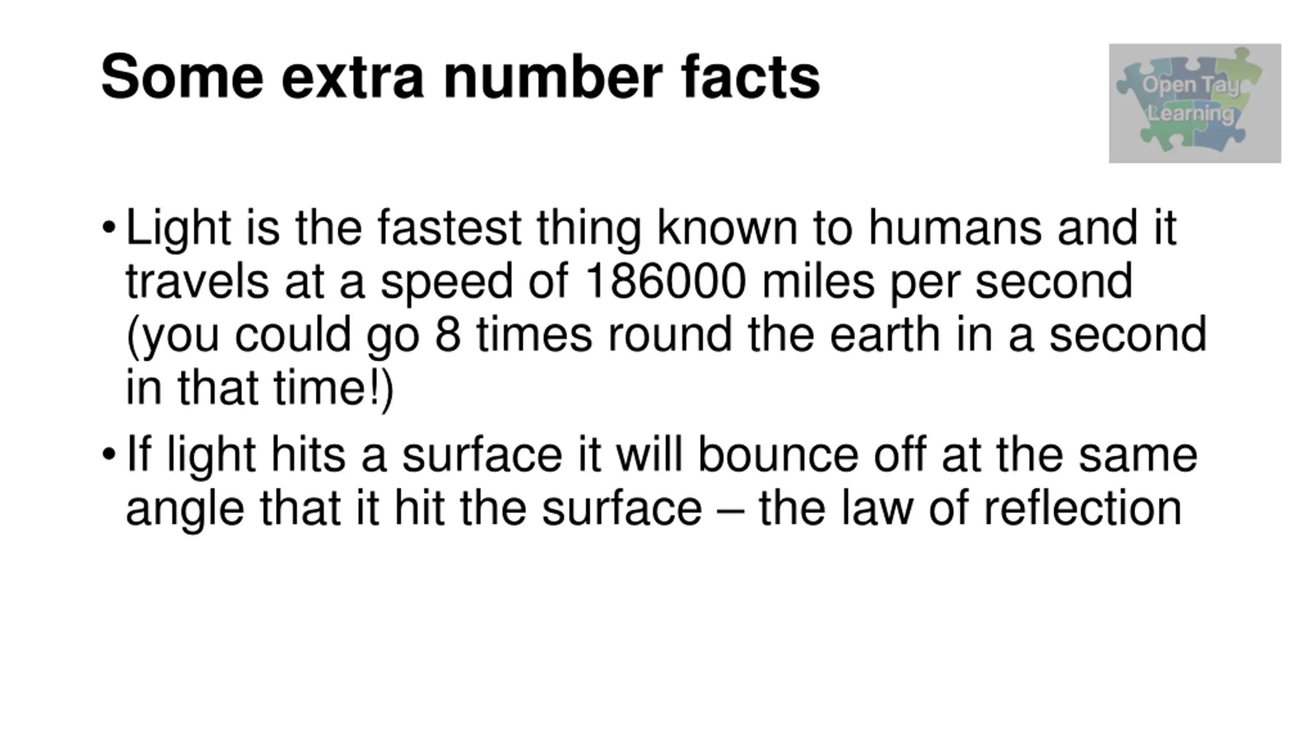 Some extra number facts Light is the fastest thing known to humans and it travels at a speed of 186000 miles per second (you could go 8 times round the earth in a second in that time!) If light hits a surface it will bounce off at the same angle that it hit the surface the law of reflection