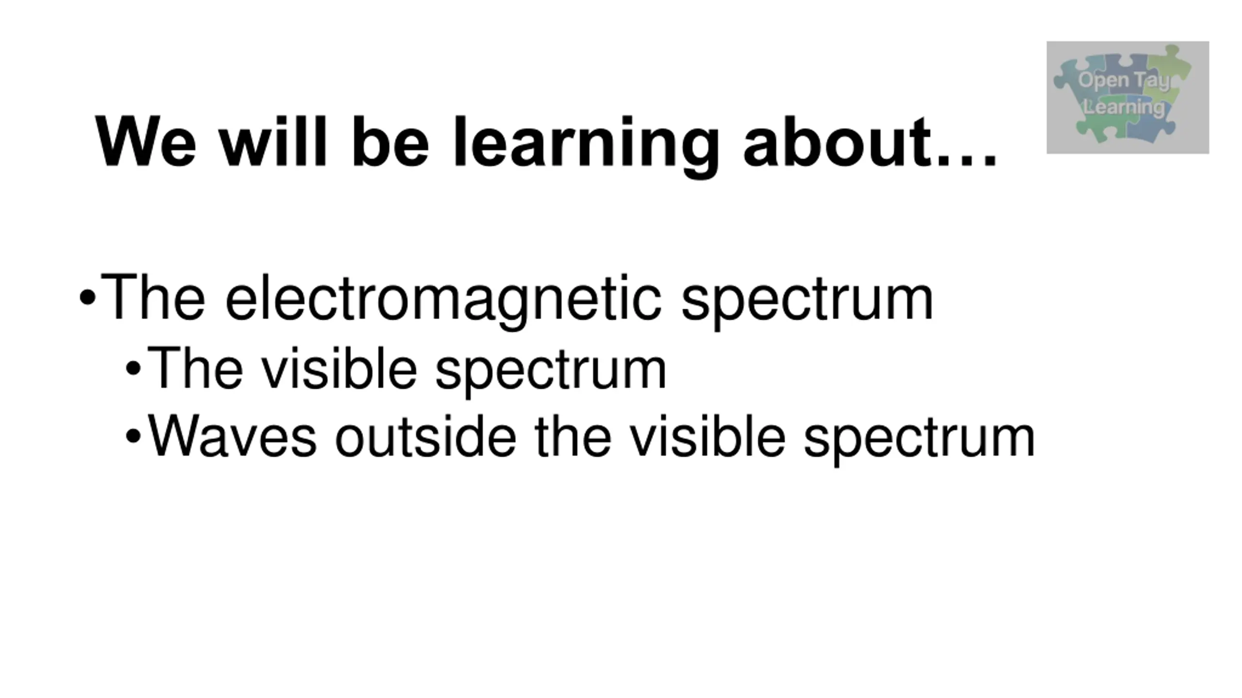 We will be learning about The electromagnetic spectrum The visible spectrum Waves outside the visible spectrum