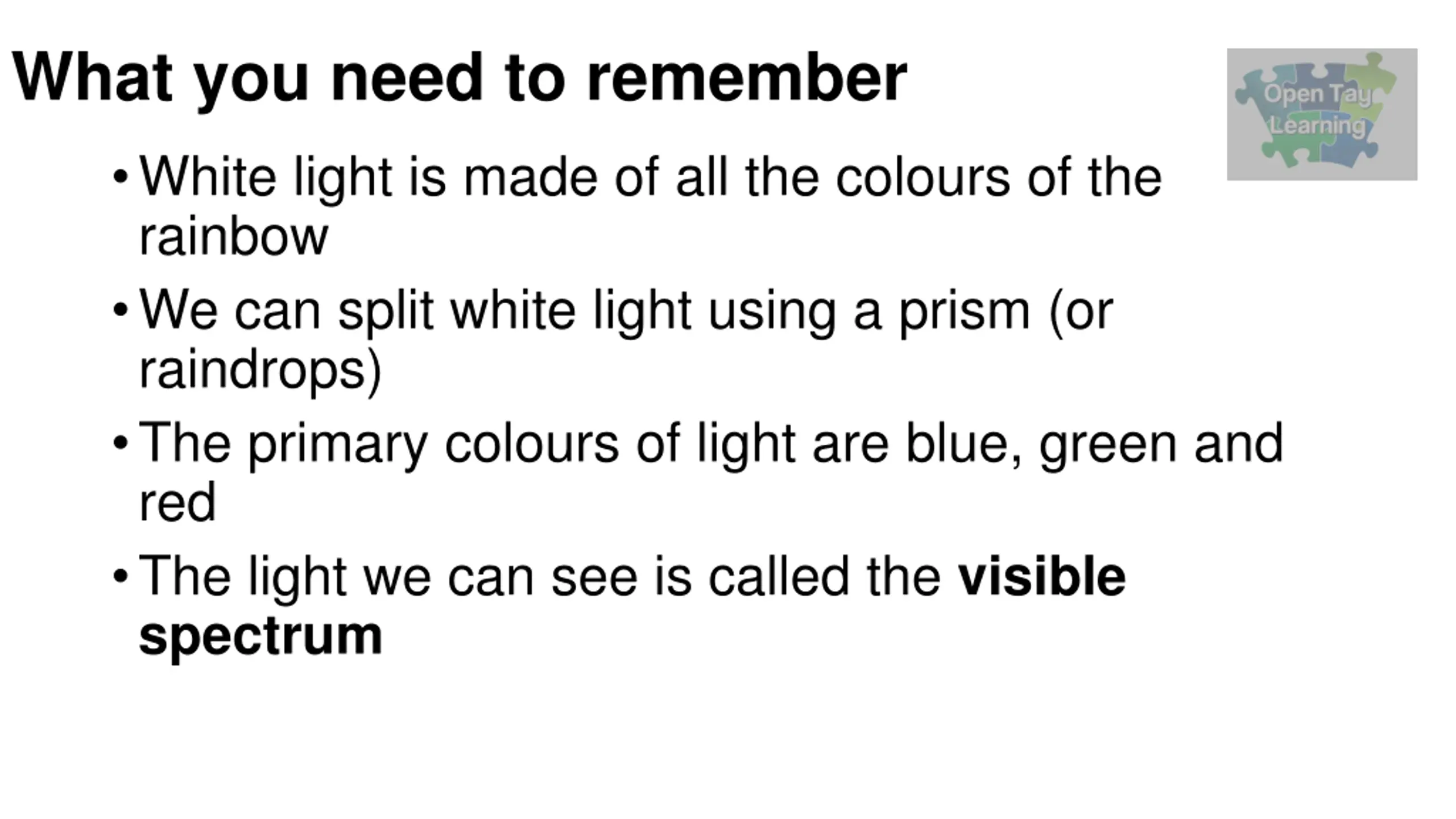 What you need to remember White light is made of all the colours of the rainbow We can split white light using a prism (or raindrops) The primary colours of light are blue, green and red The light we can see is called the visible spectrum