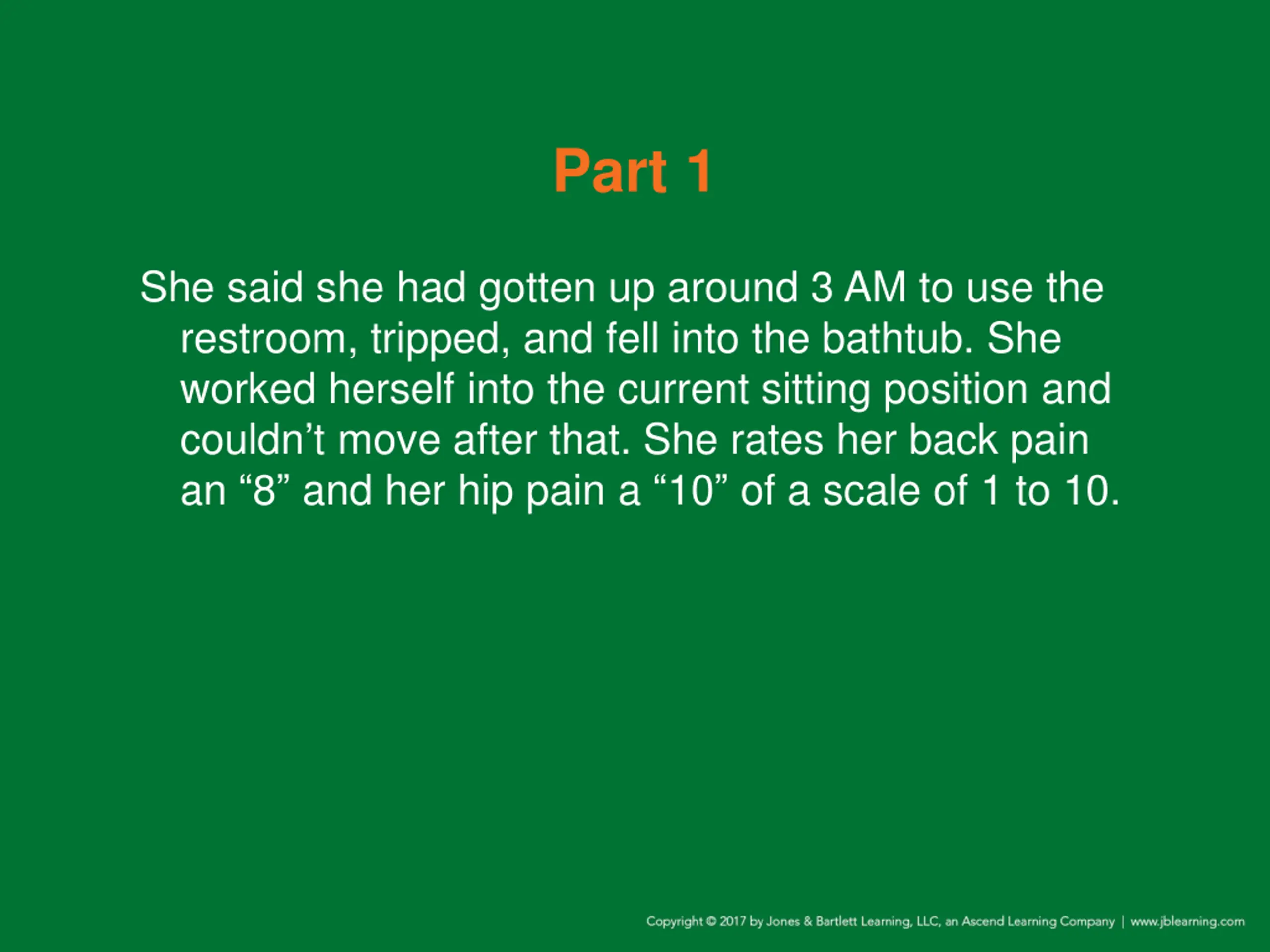 Part 1 Your BLS unit is dispatched to a home for an older woman who has fallen. You arrive on scene and are greeted by a hospice worker who found the patient in the bathtub. As you enter the bathroom, the 86-year-old patient is sitting in the bathtub without water; her back is resting on the faucet. She is pale and cold to the touch and complains of having hip and back pain and of being very cold.