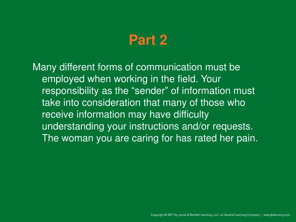 Part 2 Many different forms of communication must be employed when working in the field. Your responsibility as the sender of information must take into consideration that many of those who receive information may have difficulty understanding your instructions and/or requests. The woman you are caring for has rated her pain.