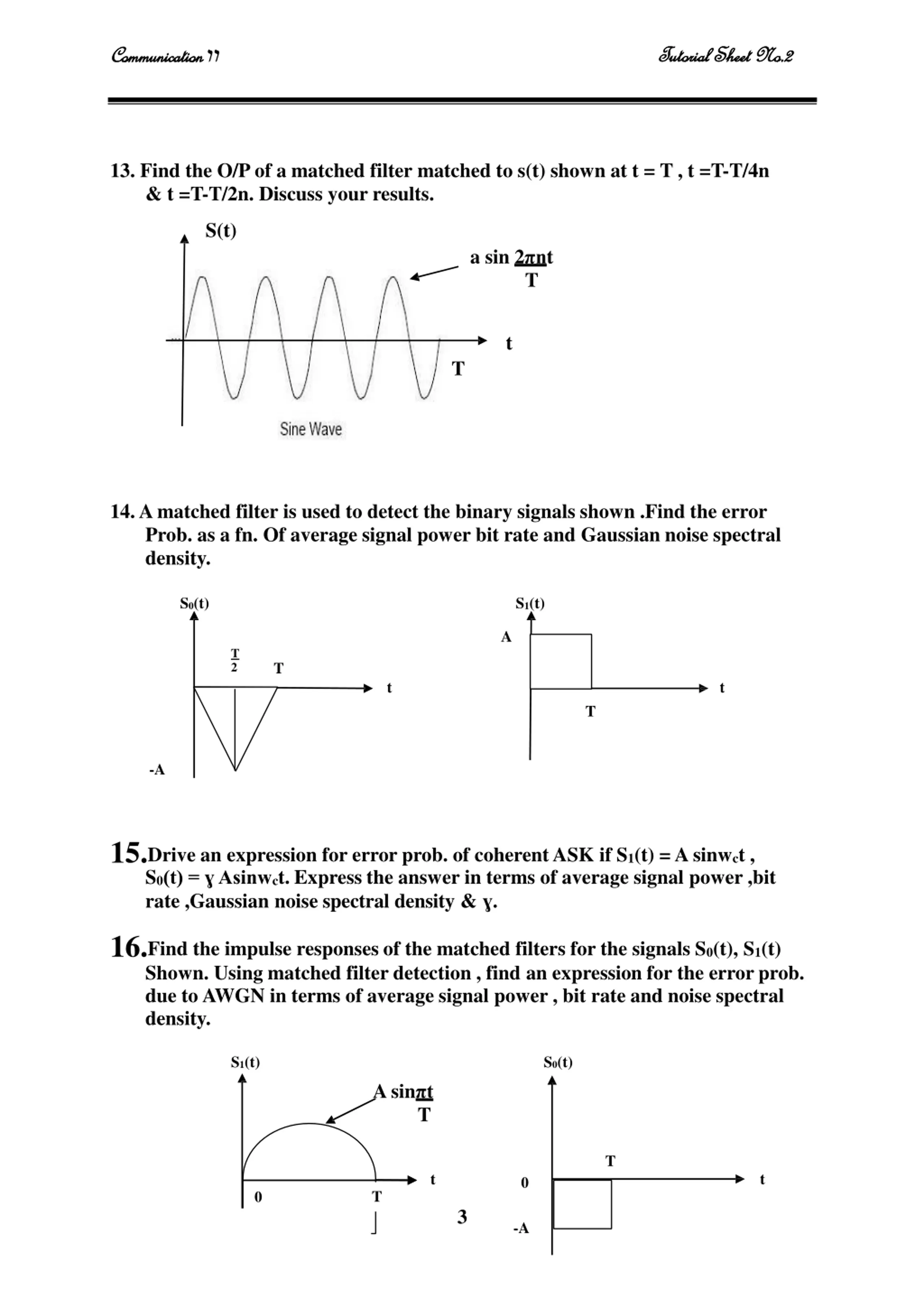 Communication Communication Tutorial Tutorial Sheet SheetNo. No.2 2 13. Find the O/P of a matched filter matched to s(t) shown at t = T , t =T-T/4n & t =T-T/2n. Discuss your results. S(t) a sin 2 nt T t T 14. A matched filter is used to detect the binary signals shown .Find the error Prob. as a fn. Of average signal power bit rate and Gaussian noise spectral density. S0(t) S1(t) A T 2 T t t T -A 15.Drive an expression for error prob. of coherent ASK if S1(t) = A sinwct , S0(t) = Asinwct. Express the answer in terms of average signal power ,bit rate ,Gaussian noise spectral density & . 16.Find the impulse responses of the matched filters for the signals S0(t), S1(t) Shown. Using matched filter detection , find an expression for the error prob. due to AWGN in terms of average signal power , bit rate and noise spectral density. S1(t) S0(t) Asin t T T t t 0 T 0 3 -A
