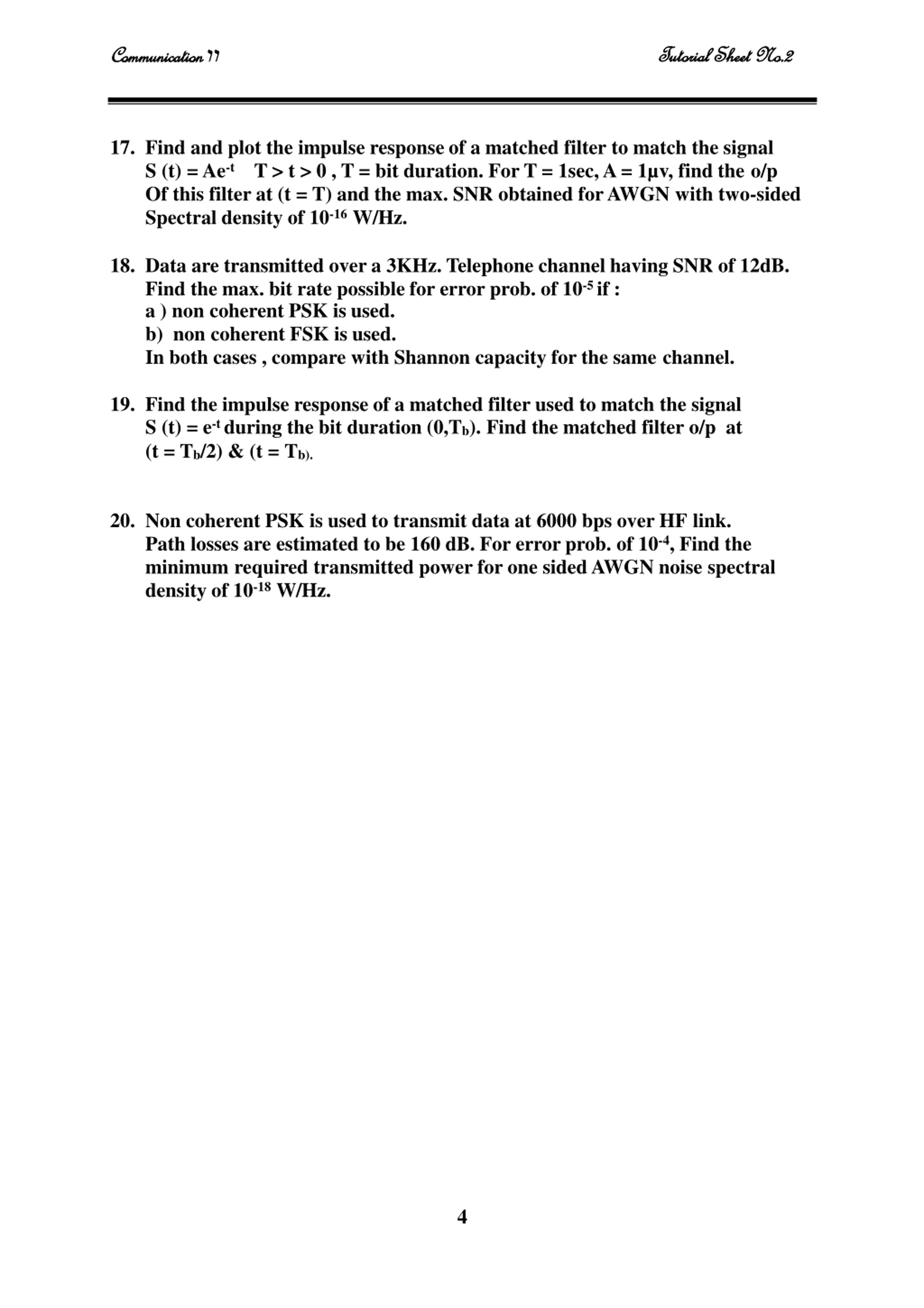 Communication Communication Tutorial Tutorial Sheet SheetNo. No.2 2 17. Find and plot the impulse response of a matched filter to match the signal S (t) = Ae-t T > t > 0 , T = bit duration. For T = 1sec, A = 1 v, find the o/p Of this filter at (t = T) and the max. SNR obtained for AWGN with two-sided Spectral density of 10-16W/Hz. 18. Data are transmitted over a 3KHz. Telephone channel having SNR of 12dB. Find the max. bit rate possible for error prob. of 10-5 if : a ) non coherent PSK is used. b) non coherent FSK is used. In both cases , compare with Shannon capacity for the same channel. 19. Find the impulse response of a matched filter used to match the signal S (t) = e-t during the bit duration (0,Tb). Find the matched filter o/p at (t = Tb/2) & (t = Tb). 20. Non coherent PSK is used to transmit data at 6000 bps over HF link. Path losses are estimated to be 160 dB. For error prob. of 10-4, Find the minimum required transmitted power for one sided AWGN noise spectral density of 10-18W/Hz. 4